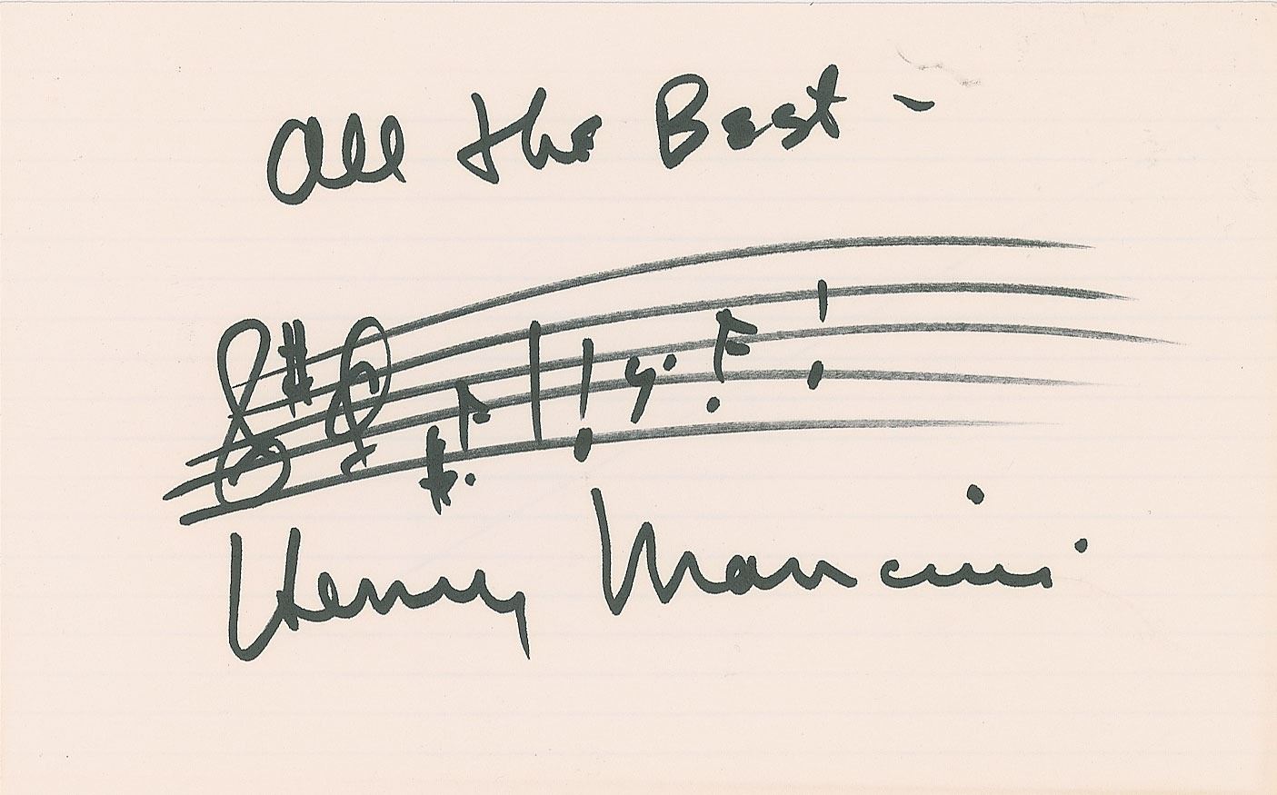 AMQS on an off-white 8 x 5 card, signed in black felt tip, "All the best—Henry Mancini." Mancini pens the first two bars of his iconic Pink Panther theme. In fine condition.