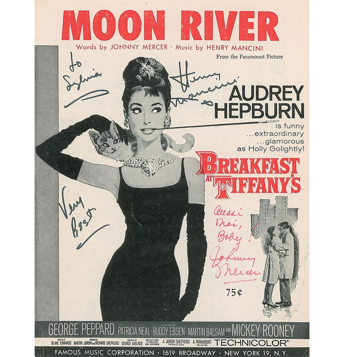 Sheet music for ‘Moon River’ from Breakfast at Tiffany’s, 9 x 12, three pages, signed and inscribed on the front cover in black felt tip, “To Sylvia, very best, Henry Mancini,” and signed in red felt tip, “Aussi Moi, Baby! Johnny Mercer.” In fine condition, with light scattered creases.