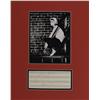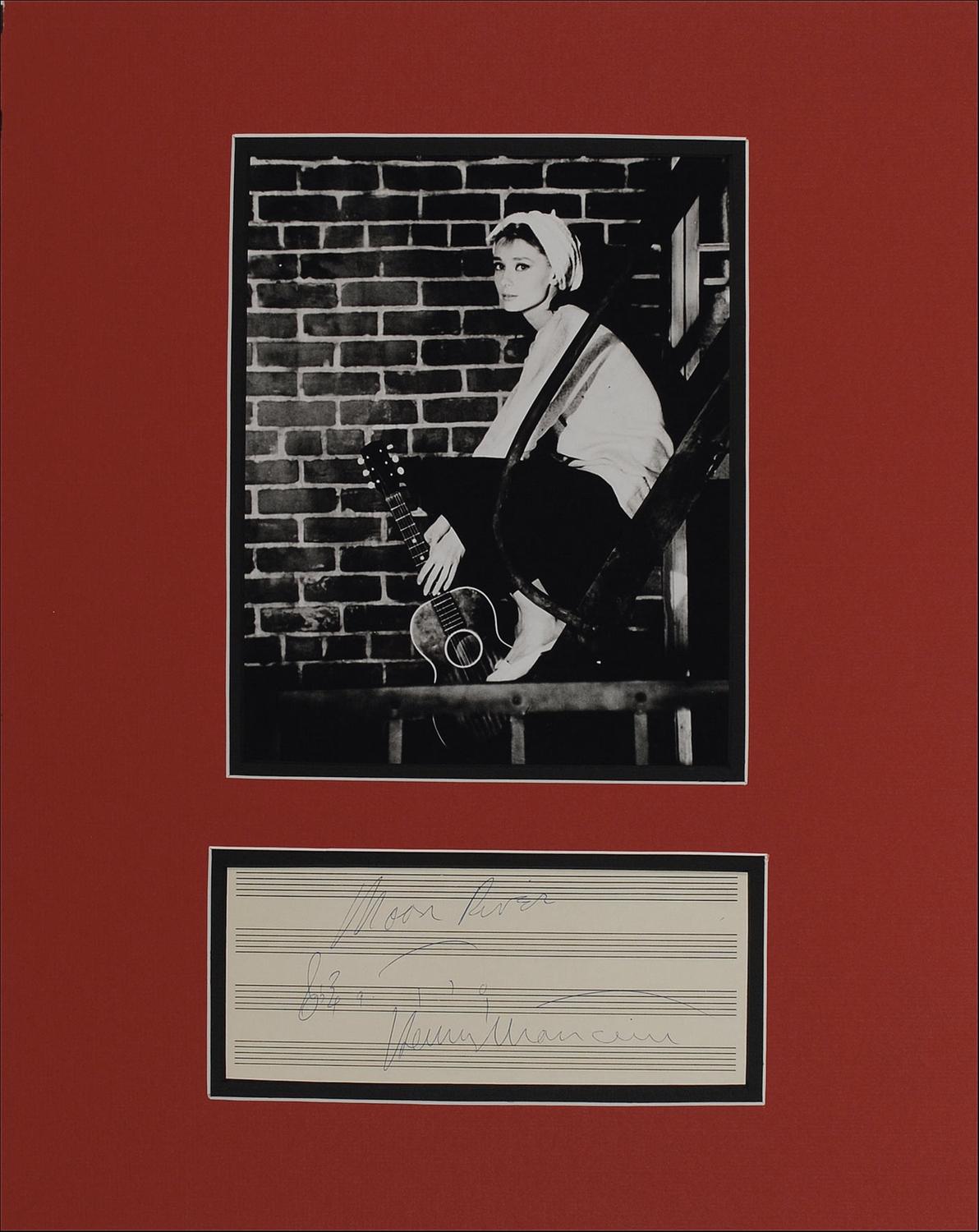 AMQS on an 8.25 x 3.5 off-white musically-lined sheet. Mancini pens two bars of music and lyrics to ‘Moon River.’ Archivally double matted with a glossy 8 x 10 photo of Audrey Hepburn posing with a guitar in the location she sings this song in the film Breakfast at Tiffany’s to an overall size of 16 x 20. In fine condition.