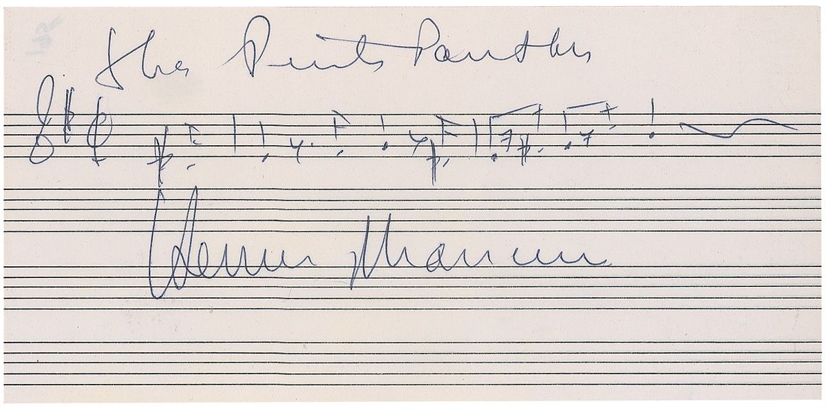 AMQS on an 8 x 4 off-white musically-lined sheet. Mancini pens the first three bars of the Pink Panther theme, titling it at the top and signing below. In fine condition, with light scattered creases.