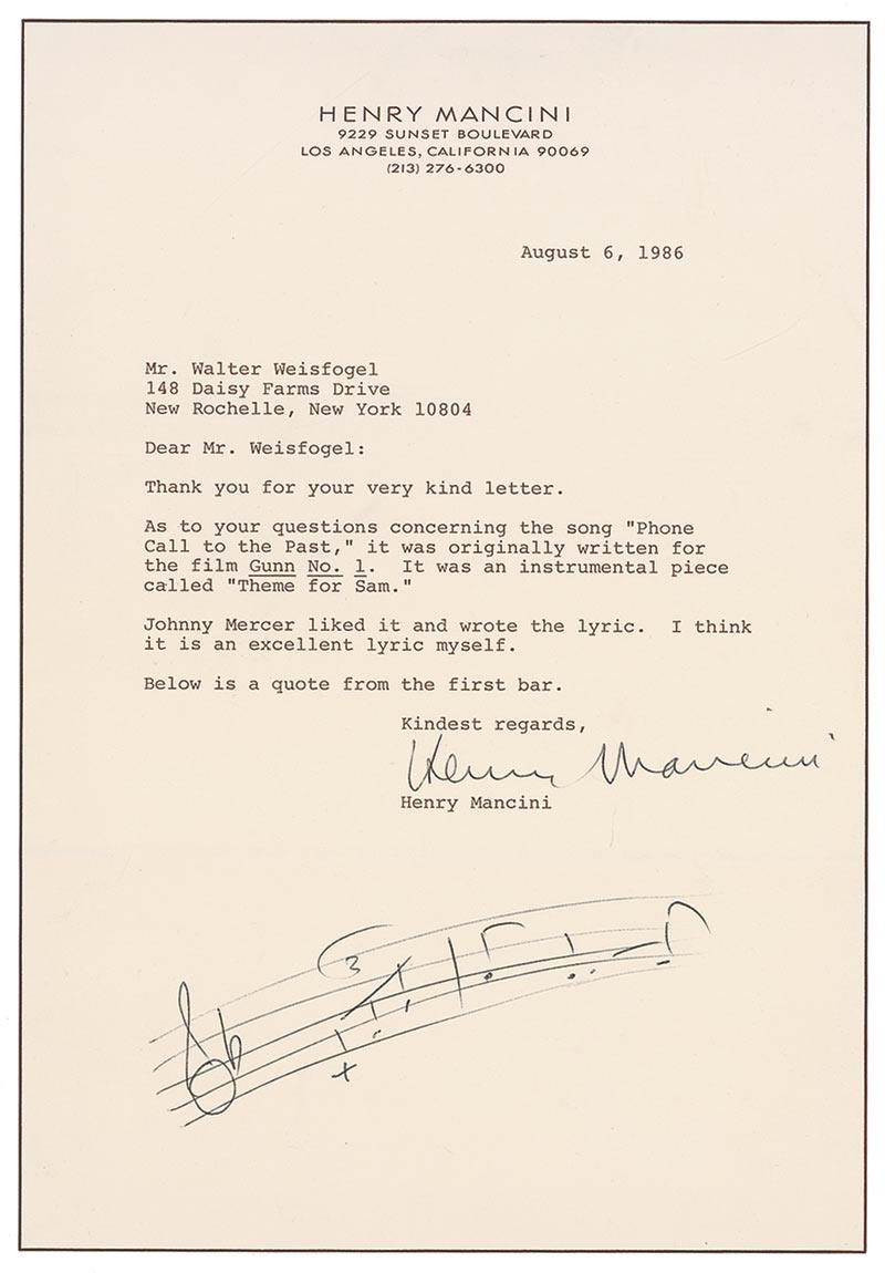 TLS, one page, 7.25 x 10.5, personal letterhead, August 6, 1986. In part: “As to your question concerning the song ‘Phone Call to the Past,’ it was originally written for the film Gunn No. 1. It was an instrumental piece called ‘Theme for Sam.’ Johnny Mercer likes it and wrote the lyric. I think it is an excellent lyric myself.” Under his signature, Mancini has added a two bar AMQS. In fine condition. Accompanied by the original mailing envelope.