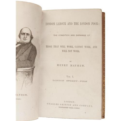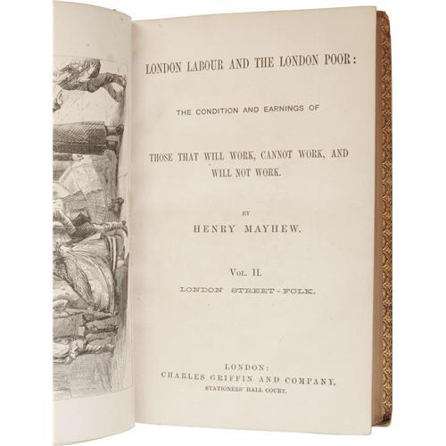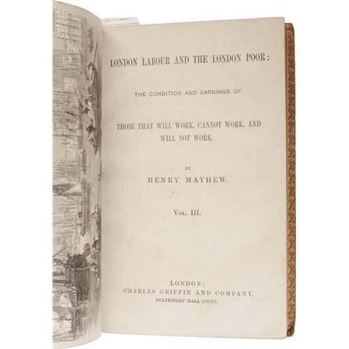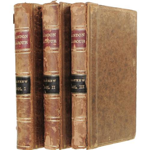 <B>Henry Mayhew: <I>London, Labour and the London Poor: the Condition and Earnings of Those that Will Work, Cannot Work, and Will Not Work</B></I></B></I> (London: Charles Griffin & Co., nd), three volumes, full calf with crimson and black bands on spine, and marbled endpapers. Gilt lettering on spine, and around borders of boards, all edges gilt, 8vo (5.5" x 8.5"). Volume I: <I>London Street-Folk,</B></I> 545 pages, boards rubbed on edges, hinges, and corners. Volume II: <I>London Street-Folk,</B></I> 576 pages, edges rubbed. Volume III: 452 pages. Textblock is tight and clean on all volumes. Binding repaired on all three volumes. <I>From the Betty Bennett Collection.</B></I><BR><BR><b>Shipping:</b> Books & Catalogs (<a target="_blank" href="http://www.heritageauctions.com/common/shipping.php">view shipping information</a>)