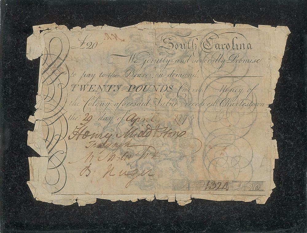 Planter and public official from South Carolina (1717–1784) who served as the second President of the Continental Congress; his tenure of five days is the shortest of all presidents. Very rare Revolutionary War-dated partly-printed DS, one page, 6 x 4.25, April 29, 1775. Early South Carolina promissory note, in full: "We jointly and severally Promise to pay to the Bearer on demand Twenty Pounds Current Money of the Colony aforesaid Value received Charlestown, the 29 day of April 1775." Signed at the conclusion by Middleton, and affixed to a slightly larger piece of cloth. In very good to fine condition.