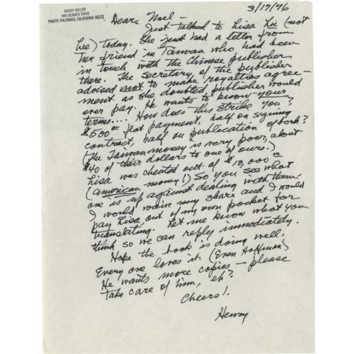 <B>Henry Miller Autograph Letter Signed,</B></I> "<I> Henry</B></I>". One page, 8.5" x 11.0", March 17, 1976, Pacific Palisades, California to "<I>Noel</B></I>" (An anonymous recipient as actor Noel Coward died in 1973). One of the most prolific authors and controversial minds of the mid-20th century, Henry Miller (1891-1980), penned such works as "Tropic of Cancer", "Tropic of Capricorn", "Why Abstract?" and "Wild About Harry". The versatile Miller was also a painter of some note. This letter reads, "<I>Just talked to Lisa Lii (not Lee) today. She just had a letter from her friend in Taiwan who had been in touch with the Chinese publisher there. The secretary of the publisher advised not to make royalties agreement as she doubted publisher would ever pay. He wants to know your terms...How does this strike you? $500 flat payment, half on signing contract, half on publication of book (The Taiwanese money is very poor, about $40 of theirs to one of ours.) Lisa was cheated out of $18,000 (American money!) So you see what one is up against dealing with them. I would receive my share and I would pay Lisa, out of my own pocket for translating. Let me know what you think so we can reply immediately. Hope the book is doing well. Everyone loves it. (Even Hoffman) He wants more copies - please take care of him, eh? Cheers!</B></I>".