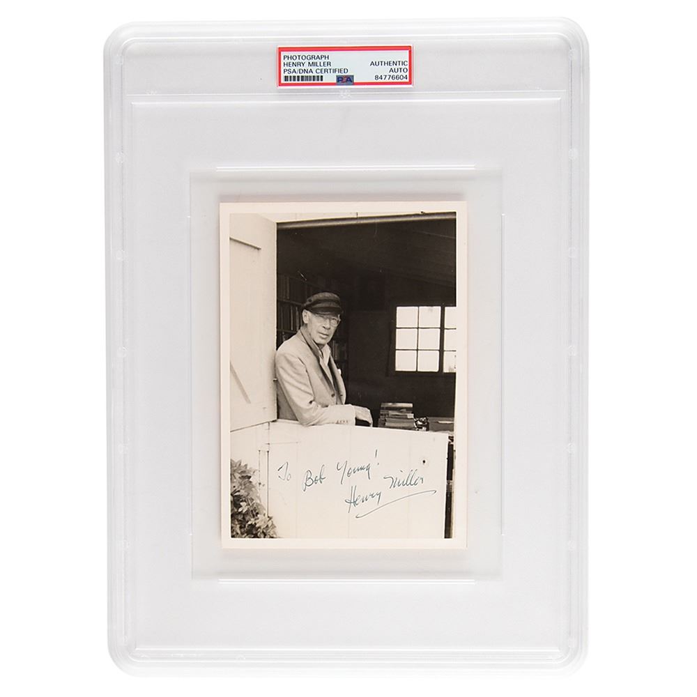 Vintage matte-finish 5 x 7 photo of Miller posing and leaning on the bottom half of a Dutch door, signed and inscribed in black ballpoint, "To Bob Young! Henry Miller.& rdquo; In fine condition. Encapsulated in a PSA/DNA authentication holder.