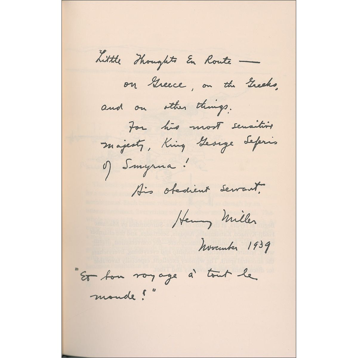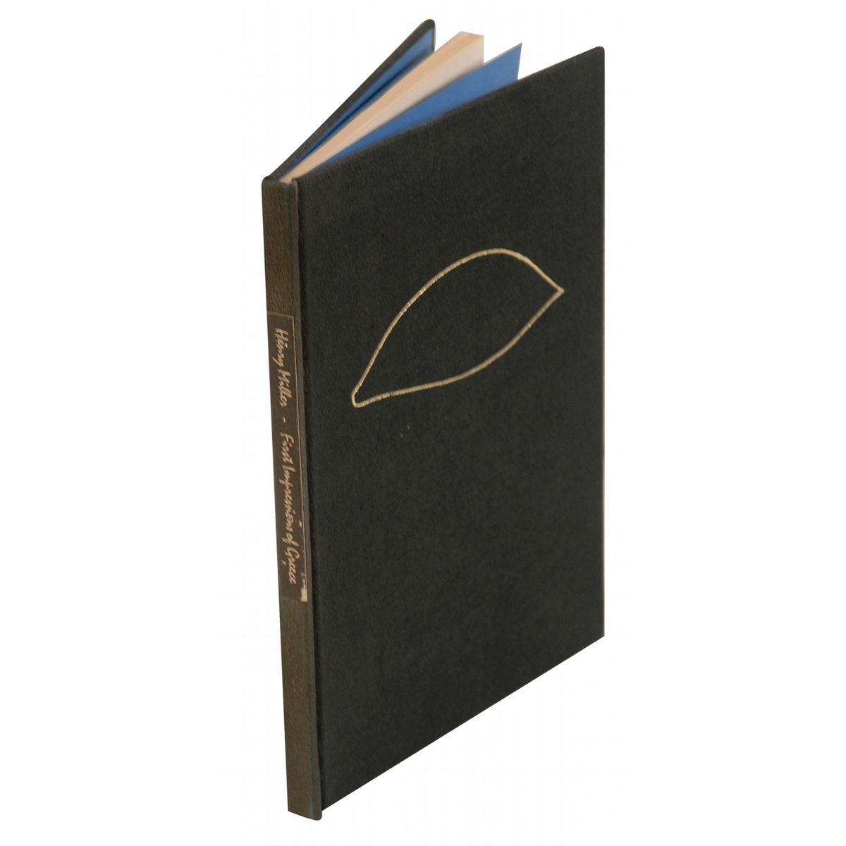Signed book: First Impressions of Greece. Limited edition first edition, #132/250. Santa Barbara: Capra Press, 1973. Hardcover, 5.75 x 8.25, 47 pages. Signed in black felt tip on the colophon page, “Henry Miller.” In fine condition.