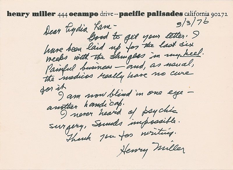 ALS, one page, folded to a size of 8.5 x 6.25, personal letterhead, March 3, 1976. Letter to Lydia Lane. In part: “I have been laid up for the last six weeks with the shingles in my heel. Painful business…I am now blind in one eye—another handicap. I never heard of psychic surgery, sounds impossible.” In fine condition.