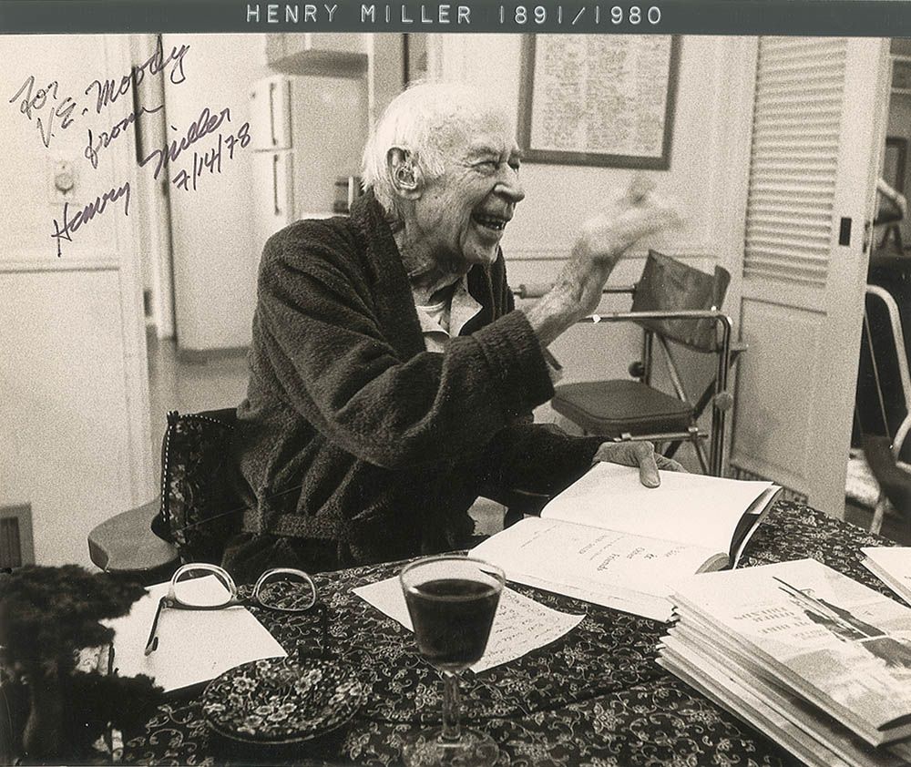 Semi-glossy 9.25 x 7.75 cardstock photo of Miller signing books in his home, signed and inscribed in black felt tip “For V. E. Moody, from Henry Miller, 7/14/78.” In very good condition, with some irregular impressions to the lower portion of the photo, lightly trimmed edges, a Dymo label affixed to the top, and slight irregular adhesion to the inscription.