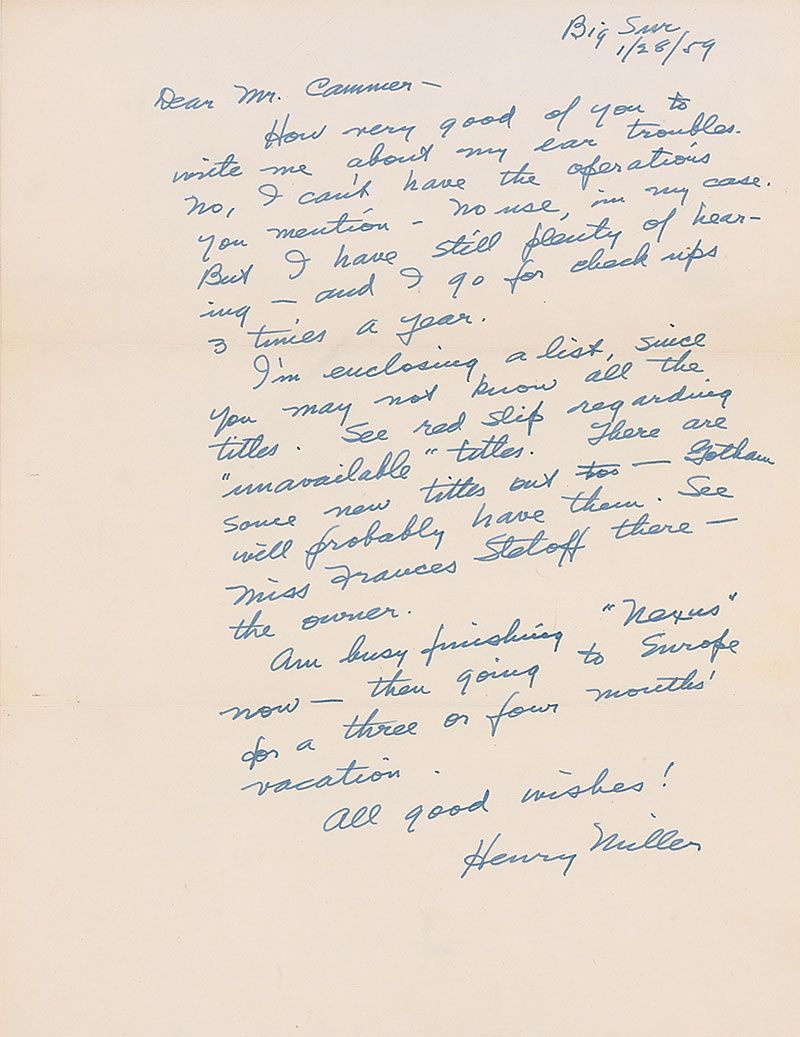 ALS, one page, 8.5 x 11, Big Sur, January 28, 1959. Letter to Moses Cammer. In part: “How very good of you to write me about my ear troubles. No, I can’t have the operations you mention—no use, in my case. But I have still plenty of hearing. I’m enclosing a list, since you may not know all the titles…Am busy finishing ‘Nexus’ now—then going to Europe for a three or four months’ vacation.” Accompanied by the list referenced, with notations by Miller handwritten inside, and brochure about his ‘Henry Miller: Recalls and Reflects’ recordings, signed at the top in fountain pen, “Have you heard these? HM.” In fine condition, with light overall wrinkling. Also accompanied by the original mailing envelope, filled out in MIller’s hand.