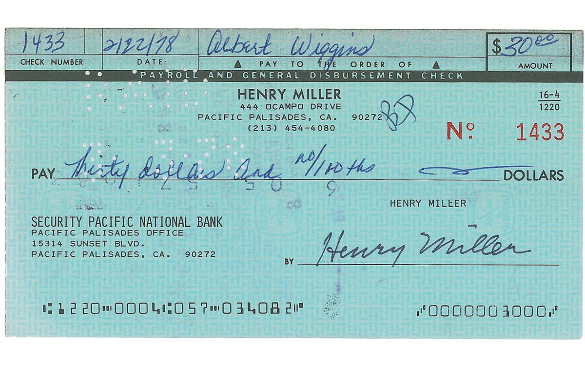 Personal check, 6 x 3.25, filled out in another hand and signed by Miller, payable to Albert Wiggins for $30, February 22, 1978. In fine condition, with expected bank stamps and cancellation holes.