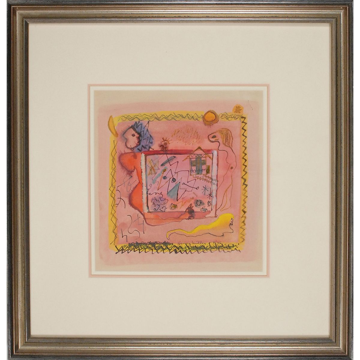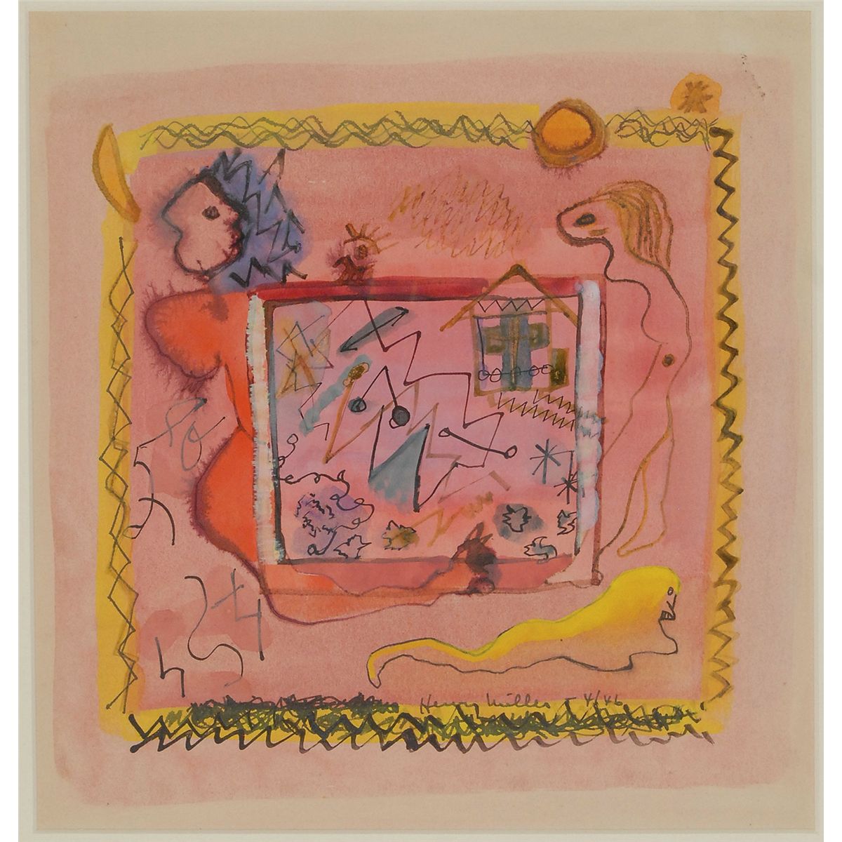 Original painting by Miller, watercolor on paper, 10.5 x 11.5, featuring vaguely female-looking serpentine figures surrounding a square of abstract figures, one resembling a house, with images of the sun and the moon around the outside. Signed near the bottom in black ink, “Henry Miller 4/46,” indicating this is the fourth watercolor made during the year of 1946. Triple-matted and framed to an overall size of 21.75 x 22.5. In fine condition. Over his lifetime, he painted over 2000 watercolors but sold few, preferring to give them to friends or sometimes trade them for food and supplies. An uncommon and particularly early offering, as most Miller artwork available to collectors dates from the 1960s or 70s. Oversized.