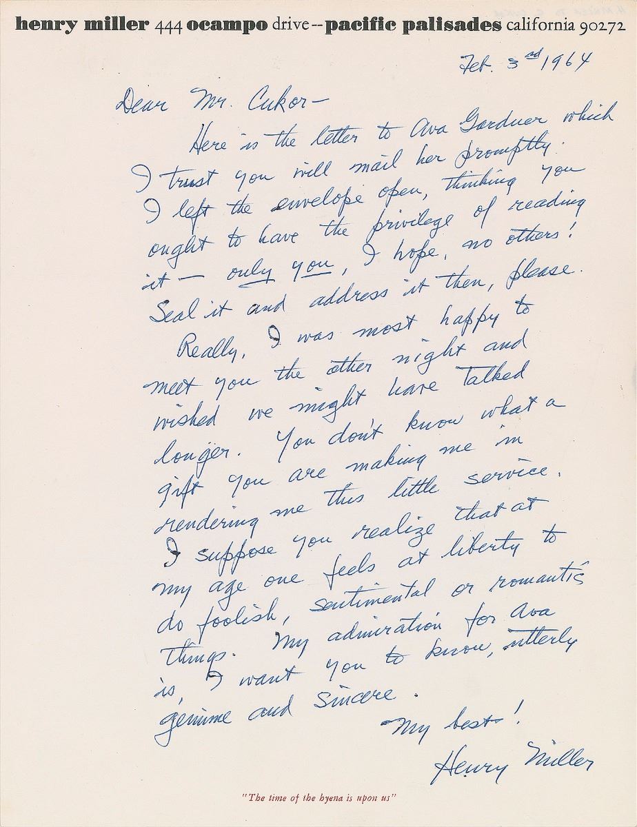 ALS, one page, 8.5 x 11, personal letterhead, February 3, 1964. Letter to director George Cukor, in full: “Here is the letter to Ava Gardner which I trust you will mail her promptly. I left the envelope open, thinking you ought to have the privilege of reading it—only you, I hope, no others! Seal it and address it then, please. Really, I was most happy to meet you the other night and wished we might have talked longer. You don’t know what a gift you are making me in rendering me this little service. I suppose you realize that at my age one feels at liberty to do foolish, sentimental or romantic things. My admiration for Ava is, I want you to know, utterly genuine and sincere.” In fine condition.