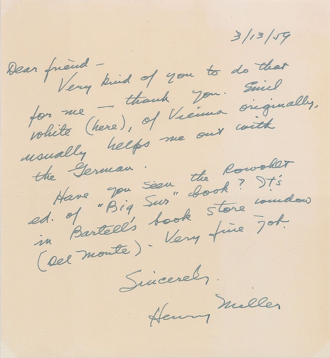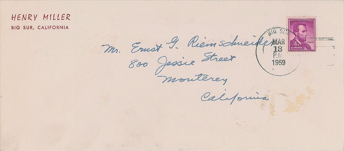 ALS, one page, 8.5 x 11, March 13, 1959. Letter to Ernst Riemschneider, in part: “Have you seen the Reworked ed. of ‘Big Sur’ book? It’s in Bartell’s book store window (Del Monte). Very fine job.” In fine condition, with intersecting folds and a slight block of toning from previous display. Accompanied by the original mailing envelope, addressed in Miller’s hand. A year after its English release, Miller’s memoir Big Sur and the Oranges of Hieronymus Bosch was published by Rowohlt in translation for his large German audience.
