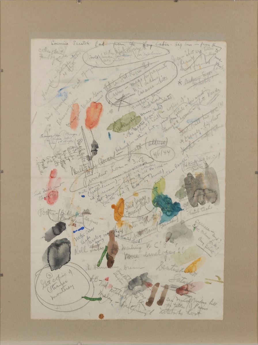 Artist’s watercolor scratch pad used by Miller when testing and creating colors to use in his paintings, one page, 13.5 x 19.5, signed and inscribed across the top in fountain pen, “Souvenir scratch pad from the Log Cabin—Big Sur—from Henry to June, 3/20/44.” The page boasts numerous dabs of color in various shades of red, blue, orange, green, black, brown, and yellow, as well as copious handwritten notes by Miller. Among these are reminders to himself, appointments scheduled, shopping lists, and various other jottings, including: “Redwood is nothing but a giant fern!,” “for Yale Review,” “Water cress, Leaks, Parsley, Onions,” “(dig up at deserted shack),” “Dentist—Next Saturday,” and “Get copies of Stranger & Monterey.” Displayed under glass to an overall size of 18 x 24. In fine condition. Miller was known to inscribe these unique ‘scratch pads’ and give them as souvenirs to his close friends; although the specific “June” who received this is not known, it was very likely his ex-wife June Miller, or his close friend June Lancaster. Overall a very interesting, visually dynamic piece.