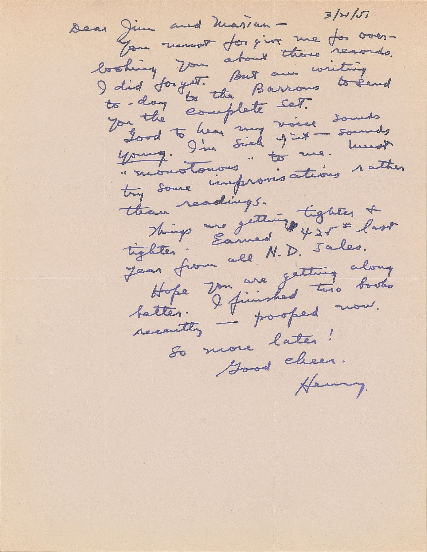 ALS signed “Henry,” one page, 8.5 x 11, March 21, 1951. Letter to "Jim and Marian," in part: "You must forgive me for overlooking you about those records. I did forget. But am writing to-day to the Barrows to send you the complete set. Good to hear my voice sounds young. I'm sick of it—sounds 'monotonous' to me. Must try some improvisations rather than readings. Things are getting tighter & tighter. Earned $425 last year from all N.D. sales. Hope you are getting along better. I finished two books recently—pooped now." In fine condition. Up to this point, Miller had published several works through New Directions, including The Cosmological Eye, The Wisdom of the Heart, Sunday After the War, The Air-Conditioned Nightmare, Why Abstract?, and Remember to Remember.