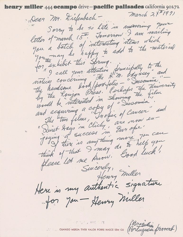 ALS, one page, 8.5 x 11, personal letterhead, March 24, 1971. Letter to Larry Diefenbach, in full: "Sorry to be so late in answering your letter of March 15th. Tomorrow I am mailing you a batch of interesting items which you may be happy to add to the material for the exhibit this spring. I call your attention principally to the notices concerning 'The H. M. Odyssey' and the handsome book/portfolio—'Insomnia'—by the Ronjon Press. Perhaps the University would be interested in showing the film and acquiring a copy of 'Insomnia.' The two films, 'Tropics of Cancer' and 'Quiet days in Clichy,' are now enjoying a success in Europe. If there is anything more you can think of that I may do to help you please let me know. Good luck!" Miller adds a brief line in black felt tip below, "Here is my authentic signature for you—Henry Miller," and then, in the lower right, "(Brazilian Portuguese proverb)." In fine condition. Accompanied by the original mailing envelope, addressed in Miller's own hand.