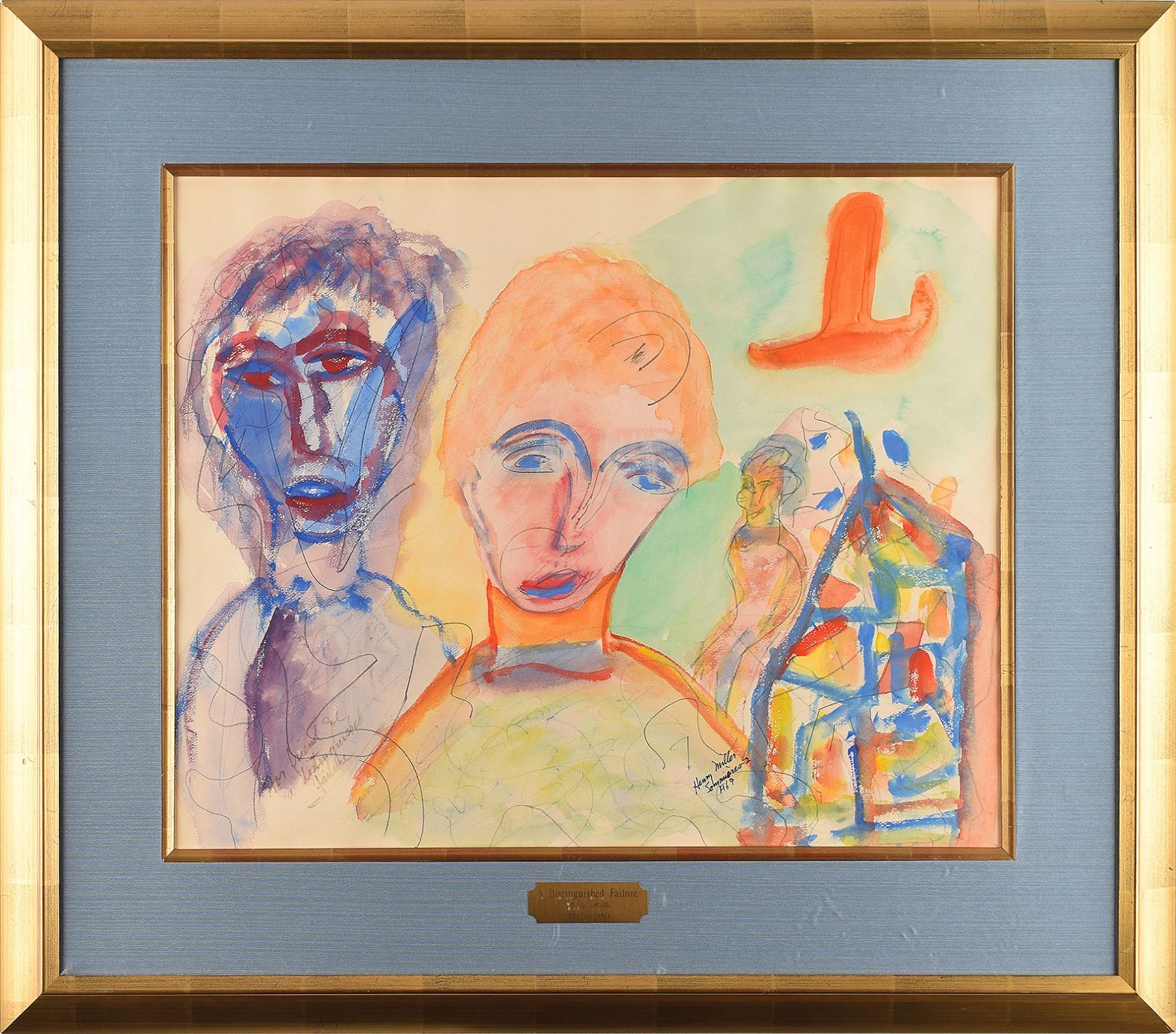 Vividly realized original painting by Henry Miller depicting two abstract figures in close-up with a third seated in the background, accomplished in watercolor on 20.75 x 16.75 artist paper, signed below in black ink, "Henry Miller, Sommières, 1967," who adds an inscription in watercolor to lower left, "For friend Joe, a distinguished failure." Attractively cloth-matted and framed with an engraved plaque to an overall size of 29.75 x 26. In fine condition. Over his lifetime, Miller painted over 2000 watercolors but sold few, preferring to give them to friends or sometimes trade them for food and supplies. The "Joe" to whom this painting is inscribed is likely Joe Gray, an actor, stuntman, and close friend of Miller's.