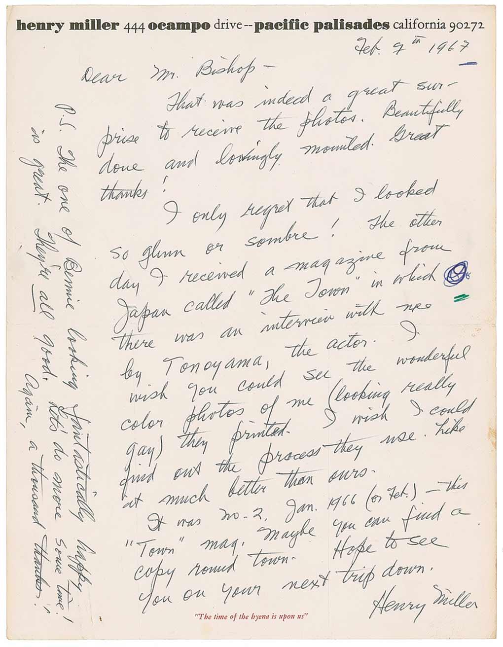 Author whose candid treatment of sex in such novels as Tropic of Cancer and Tropic of Capricorn clashed with traditional mores and censorship standards. ALS, one page, 8.5 x 11, personal letterhead, February 9, 1967. Letter to friend Jim Bishop. In part: “That was indeed a great surprise to receive the photos…I only regret that I looked so glum or sombre! The other day I received a magazine from Japan called ‘The Town’ in which there was an interview with me by Tonoyama, the actor. I wish you could see the wonderful color photos of me (looking really gay) they printed. I wish I could find out the process they use. Like it so much better than ours.” In fine condition, with intersecting mailing folds, and some light edge toning.