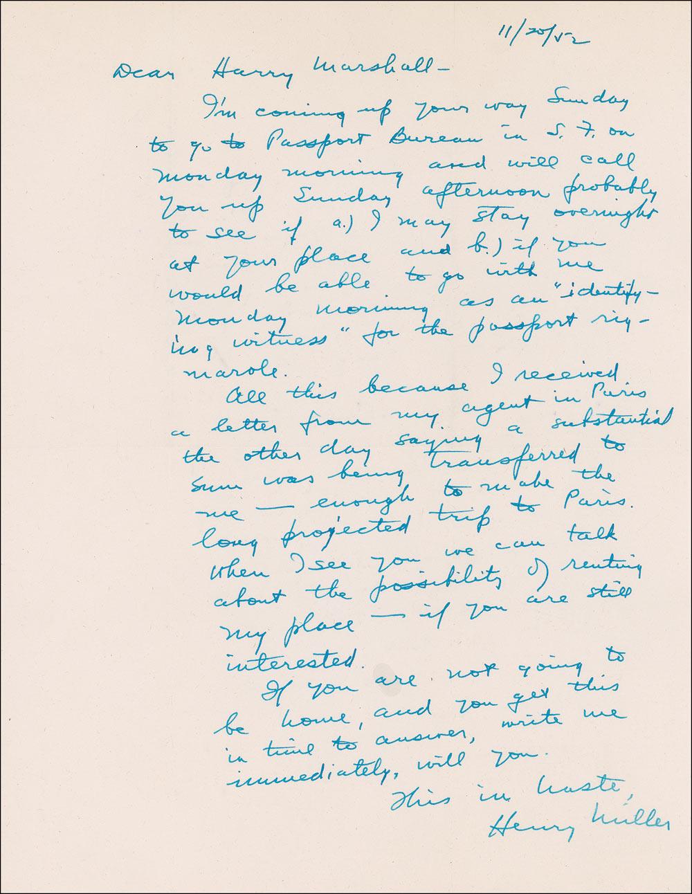 ALS, one page, 8.5 x 11, November 25, 1952. Letter to Harry Marshall. In part: “I’m coming up your way Sunday to go to Passport Bureau in S.F.…and will call you up Sunday afternoon to see if a. I may stay overnight at your place and b. If you would be able to go with me Monday morning as an ‘identifying witness’ for the passport rigmarole. All this because I received a letter from my agent in Paris the other day saying a substantial sum was being transferred to me—enough to make the long projected trip to Paris.” In fine condition, with intersecting mailing folds.