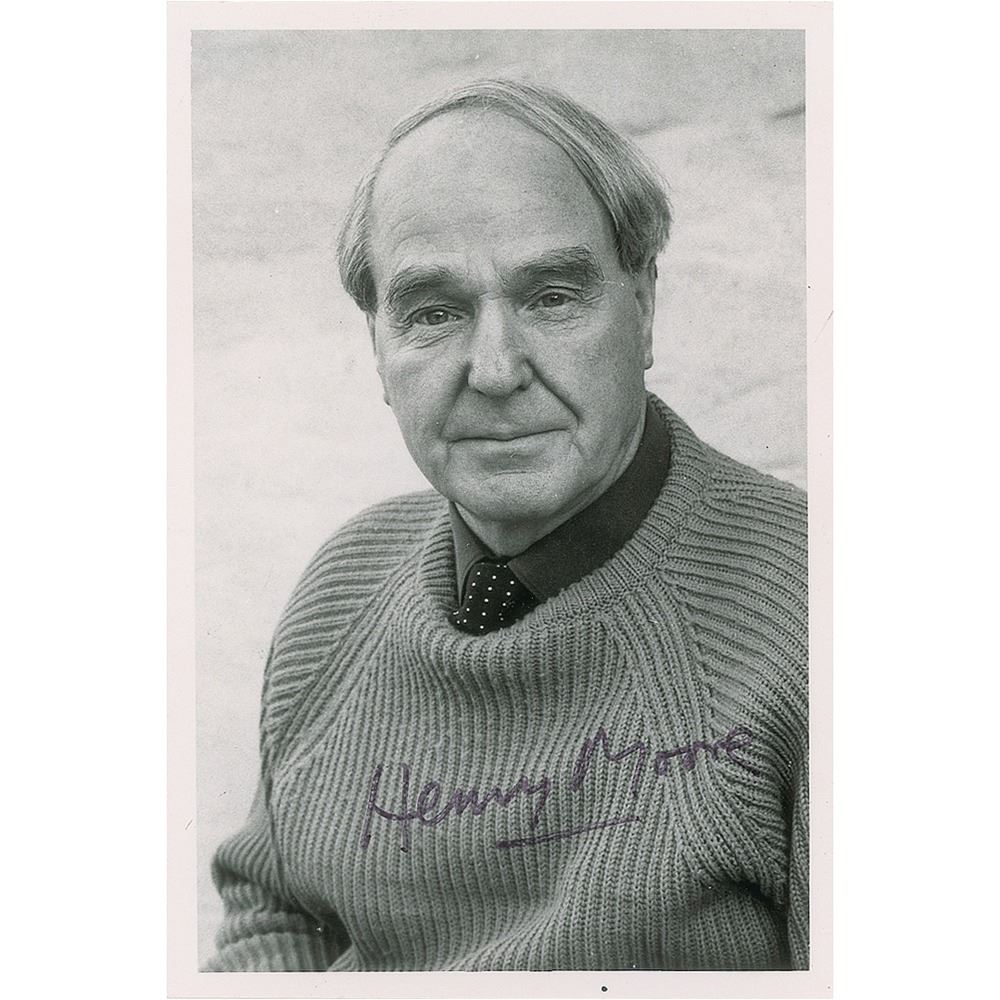 Glossy 3.5 x 5.25 silver gelatin photo of the English sculptor known for his semi-abstract works, signed in black felt tip by Henry Moore. In fine condition.