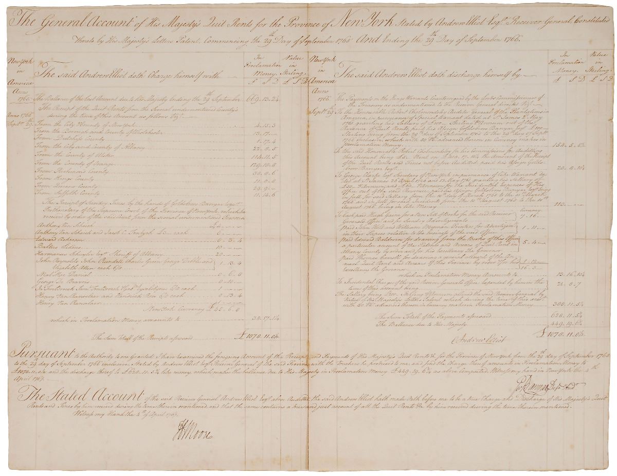 Manuscript DS, signed “H: Moore,” one page, 22 x 17, April 4, 1767. Document headed “The General Account of His Majesty’s Quit Rents for the Province of New York, Stated by Andrew Elliot Esq:r Receiver General Constituted Thereto by His Majesty’s Letters Patent, Commencing the 29th Day of September 1765 And Ending the 29th Day of September 1766.” The document offers detailed information as to the rents paid in proclamation money on New York lands to the Crown, amounting to a total of £1078. Signed at the conclusion of the accounting by Andrew Elliot and signed in the lower left by Governor Moore. In very good to fine condition, with splitting to folds and hinge. Moore served as the colonial governor of New York from 1765 to 1769, while Elliot was a loyalist and one of the members of the delegation that met with George Washington to plead for the life of the spy John Andre in 1783. This is a rare and historically informative account of the colonial era in the period just preceding the American Revolution.