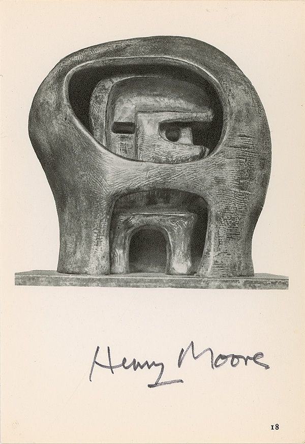 Intriguing 4 x 6 book photo of one of Moore’s abstract sculptures, signed in black felt tip. In fine condition.