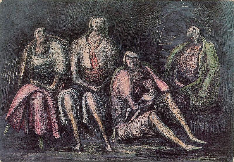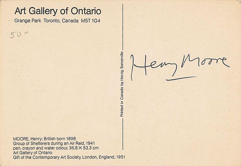 Color postcard of Moore’s 1941 work entitled ‘Group of Shelterers During an Air Raid,’5.75 x 4, signed on the reverse in black ballpoint. In fine condition, with a small pencil notation and mild toning to reverse.