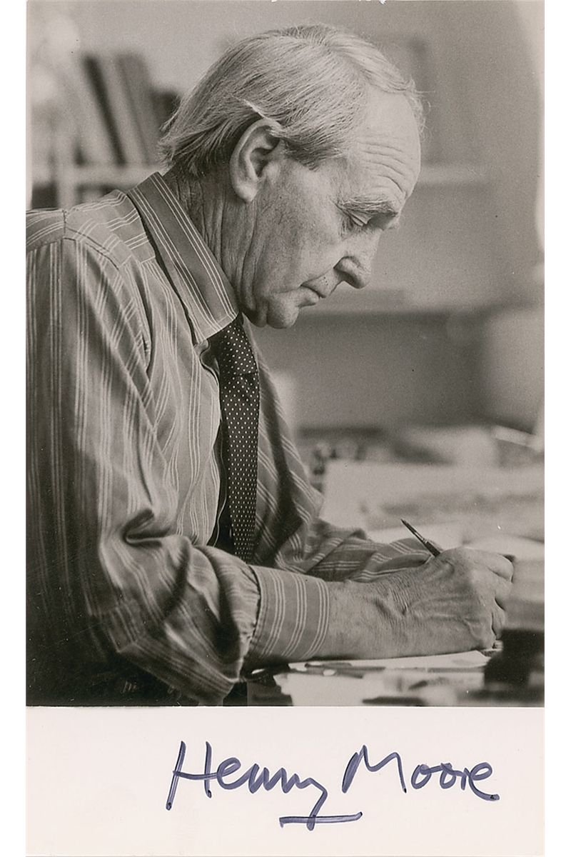 Distinguished English artist (1898–1986) best known for his abstract, often biomorphic sculptures. Glossy 3.25 x 5.25 photo of Moore holding a paintbrush, signed in the lower border in black felt tip. In fine condition.