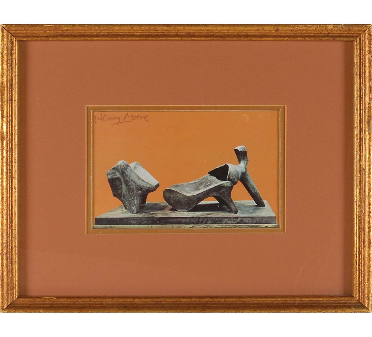 Color 5.75 x 4 postcard photo of his 1963 bronze ‘Three Piece Reclining Figure No. 2: Bridge Prop,’ signed in the upper left in black felt tip. Double-matted and framed to an overall size of 11.25 x 9.5. In fine condition, with irregular adhesion to the signature.