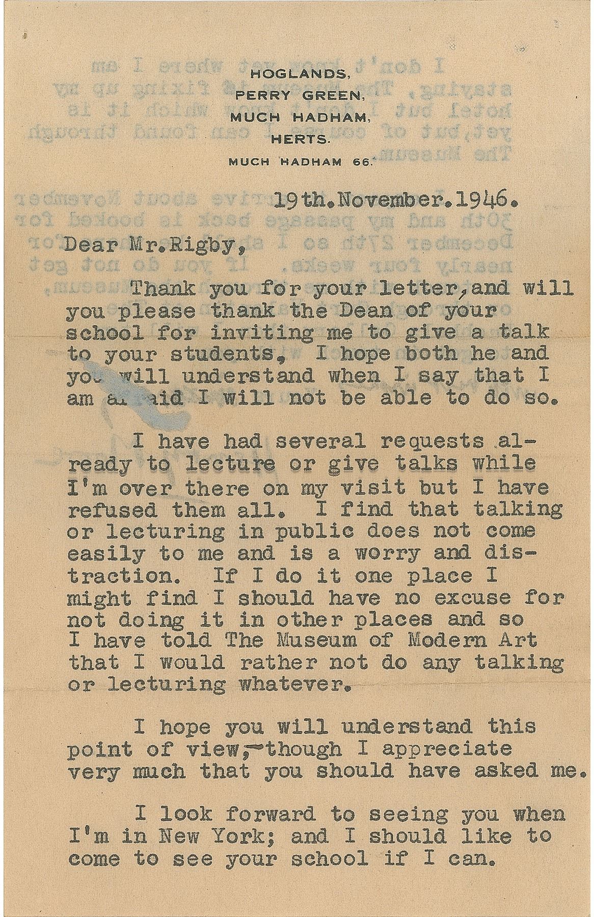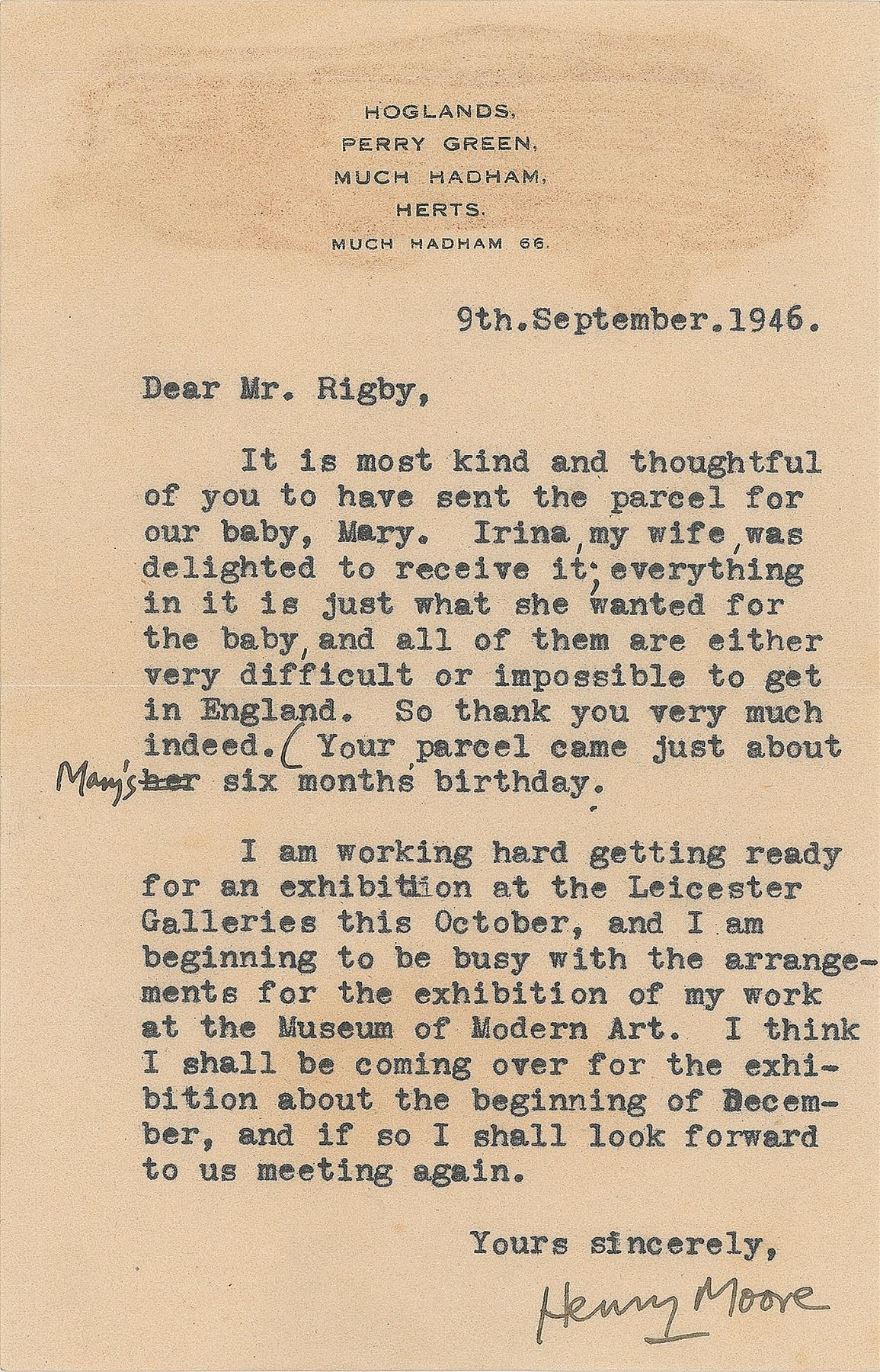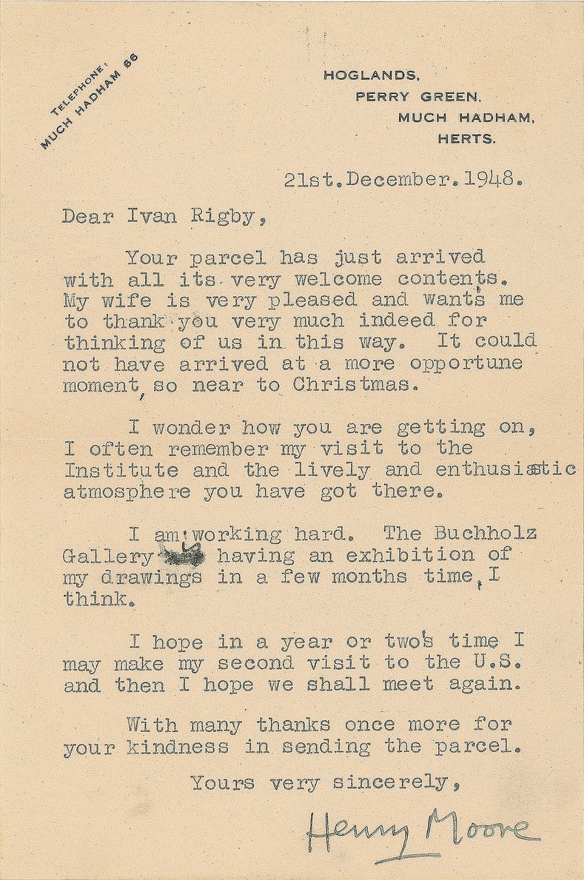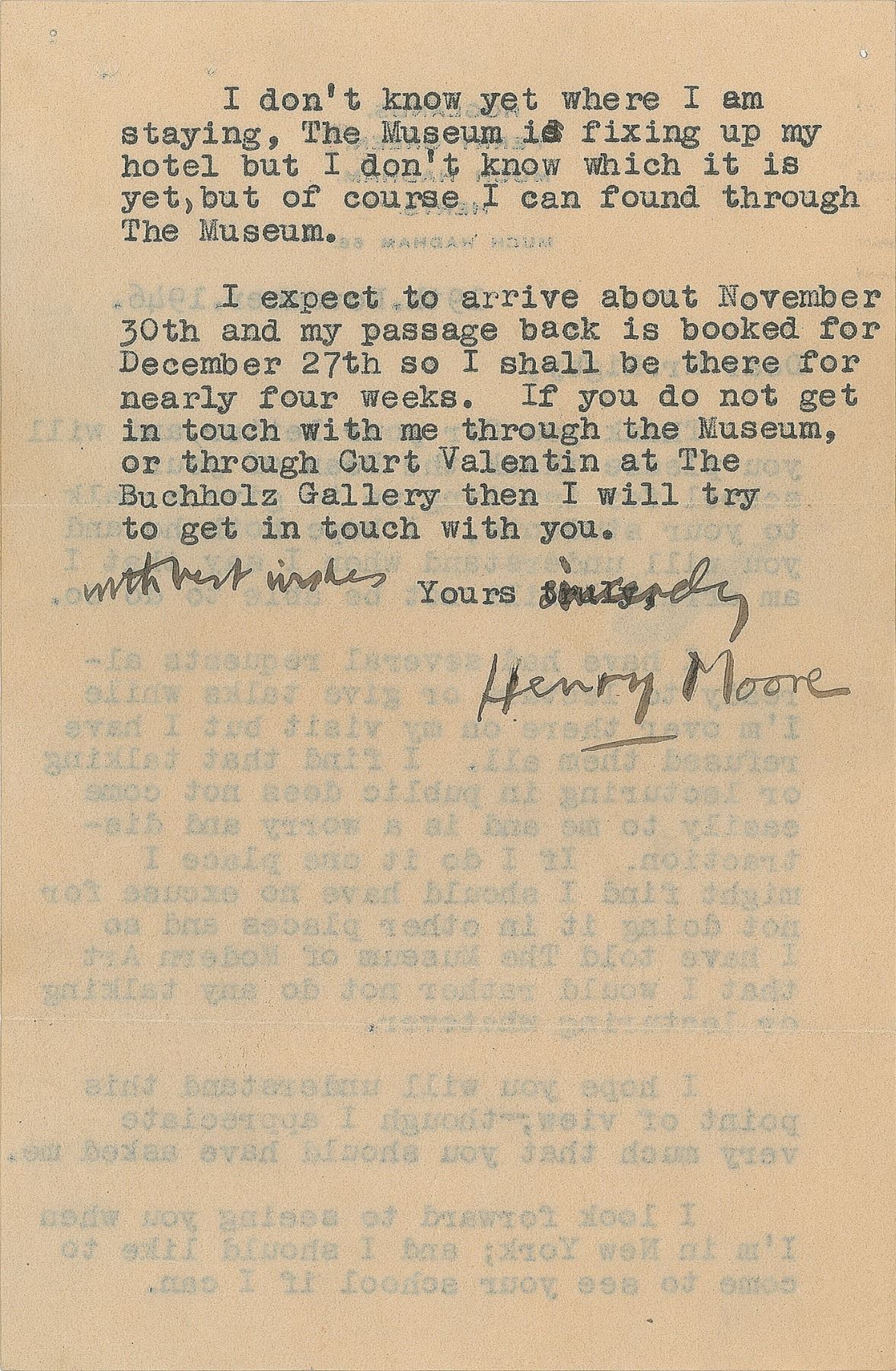 Group of three TLSs, four total pages, each approximately 4.5 x 7, Hogsland, Perry Green letterhead, dated between 1946 and 1948, each addressed to fellow sculptor Ivan Rigby of the Pratt Institute. The earliest letter, September 9, 1946, in part: "I am working hard getting ready for an exhibition at the Leicester Galleries this October, and I am beginning to be busy with the arrangements for the exhibition of my work at the Museum of Modern Art." The second letter, November 19, 1946, in part: "I have had several requests already to lecture or give talks while I'm over there on my visit but I have refused them all. I find that talking or lecturing in public does not come easily to me and is a worry and distraction. If I do it one place I might find I should have no excuse for not doing it in other places and so I have told The Museum of Modern art that I would rather not do any talking or lecturing whatever." The third and final letter, December 21, 1948, in part: "I am working hard. The Buchholz Gallery's having an exhibition of my drawings in a few months time, I think. I hope in a year or two's time I may make my second visit to the U.S. and then I hope we shall meet again." Moore makes a few corrections to the text in his own hand. In overall fine condition, with light show-through from old adhesive residue on the reverse of the September letter. Accompanied by two original mailing envelopes.