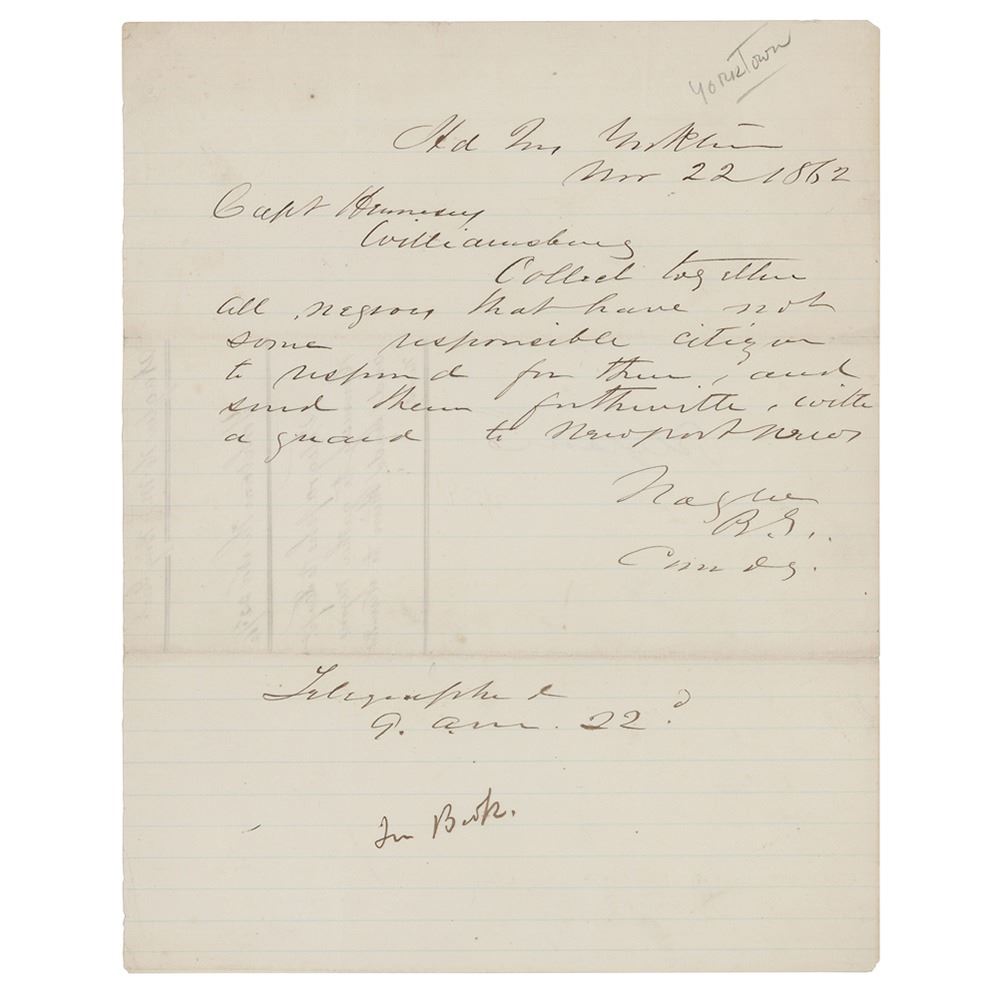 Civil War-dated ALS signed “Naglee, B. G. Comdg.,†one page, 7.75 x 9.75, November 22, 1862. Intriguing handwritten telegraph letter to Captain Hennessy, sent from Yorktown. In full: "Collect together all negroes that have not some responsible citizen to respond for them, and send them forthwith, with a guard to Newport News." In fine condition.
