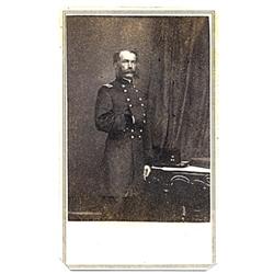 Led the 1st New York Volunteers in California and Baja California during Mexican War. Was a banker in San Francisco, and returned to that area after the War. Knees-up beside desk with curtain behind-- less common that the typical Brady setting. CDV by Anthony/Brady is slightly dark. Lower mount corners minutely clipped. [3]