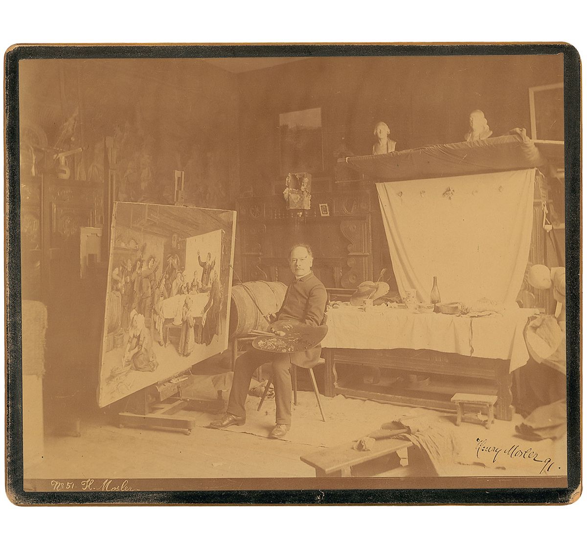 American artist (1841–1920) who documented American life, best known for his portraits and work during the Civil War. Exceptional original 11.75 x 9.5 mounted albumen photo of Mosler in his studio while working on ‘Wedding Feast in Brittany,’ signed in the lower right in black ink, “Henry Mosler, 91.” Some chipping and rubbing to edges of mount and slight irregular adhesion to signature, otherwise fine condition. ‘Wedding Feast in Brittany,’ considered by many Mosler’s greatest work, was donated to the Metropolitan Museum of Art in 1898 by a patron. A beautiful, scarce portrait of the artist while painting one of his most important works.
