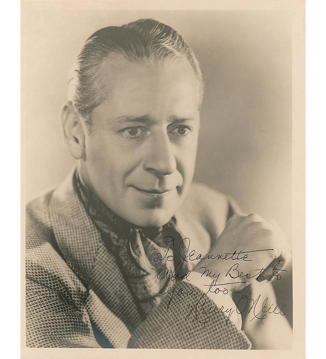 Silver-haired character actor who worked on the stage and went on to play top supporting roles in hundreds of films. Vintage matte-finish 8 x 10 photo, signed and inscribed in black ink “To Jeannette, and my best too, Henry O’Neill.” In fine condition, with a bit of scattered light silvering.
