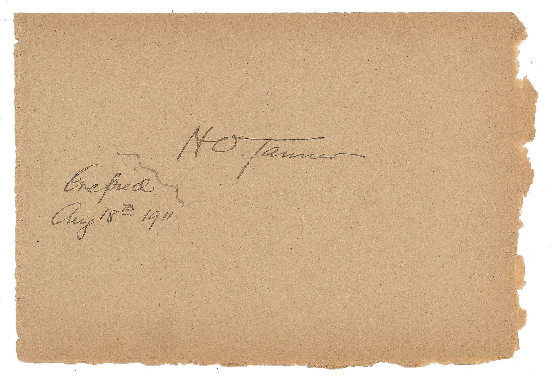 American artist and the first African-American painter to gain international acclaim (1859–1937). His oil painting Sand Dunes at Sunset, Atlantic City, which hangs in the Green Room at the White House, is the first painting by an African-American artist to have been purchased for the permanent collection of the White House. Rare fountain pen signature, "H. O. Tanner, Trepied, Aug. 18th, 1911,” on an off-white 6.5 x 4.5 album page. In fine condition.