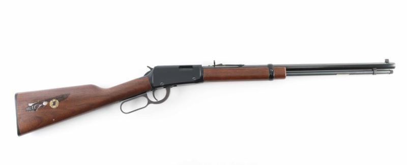 NRA Special Edition lever action rimfire rifle features NRA logo and engraved bald eagle in flight on right side of butt, blued finish, plain wood stock & forend, 20" octagonal barrel with full length magazine tube underneath, buckhorn style sights. Bore is very good condition. Metal surfaces retain 95% finish with some scuffing near muzzle, few small spots of bare metal showing on corners of receiver. Stock is near excellent condition with visible small round gouge on right side of butt. Condition is NRA Very Good++ *** Modern Firearm ***