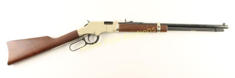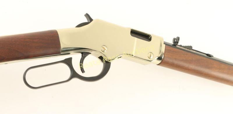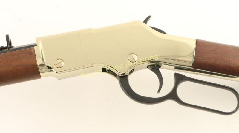 SN: GB312855 'Golden Boy' American made lever-action repeating rifle chambered in .22 Short, Long or Long Rifle. Features a blued 20" octagonal barrel, full tube magazine, blade front sight with brass bead, adjustable semi-buckhorn rear sight, brass receiver & barrel band, serrated trigger & hammer spur, smooth American Walnut forend and straight grip shoulder stock with brass buttplate. Includes the original cardboard box with documents and lock. Rifle exhibits approximately 99%+ of it's original finish showing little to no visible wear. Action is smooth, bore is pristine and wood stocks are fine. Condition is like new in box. ***Modern Firearm***