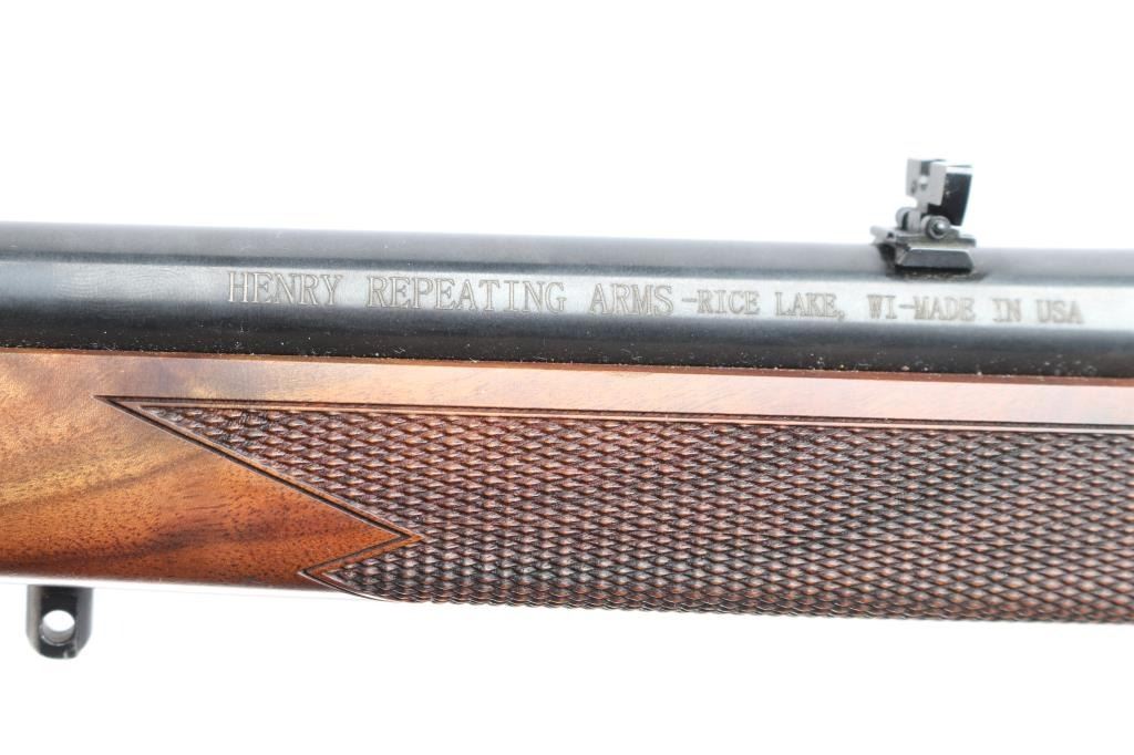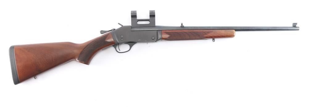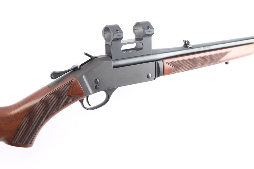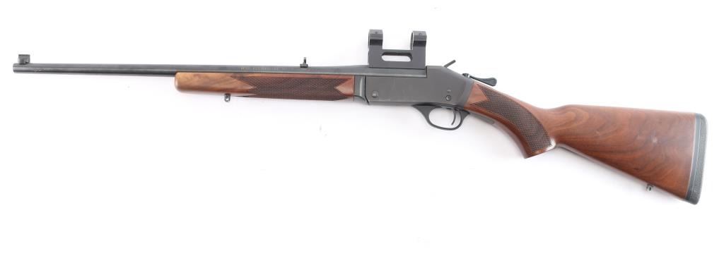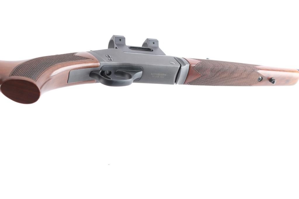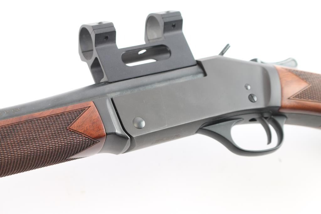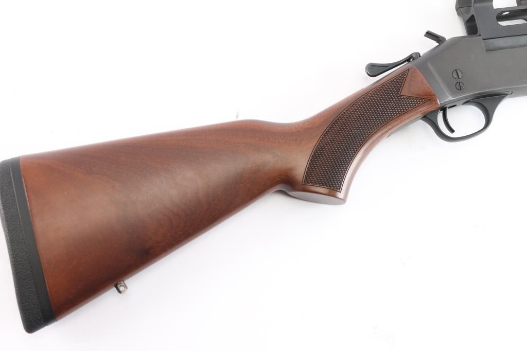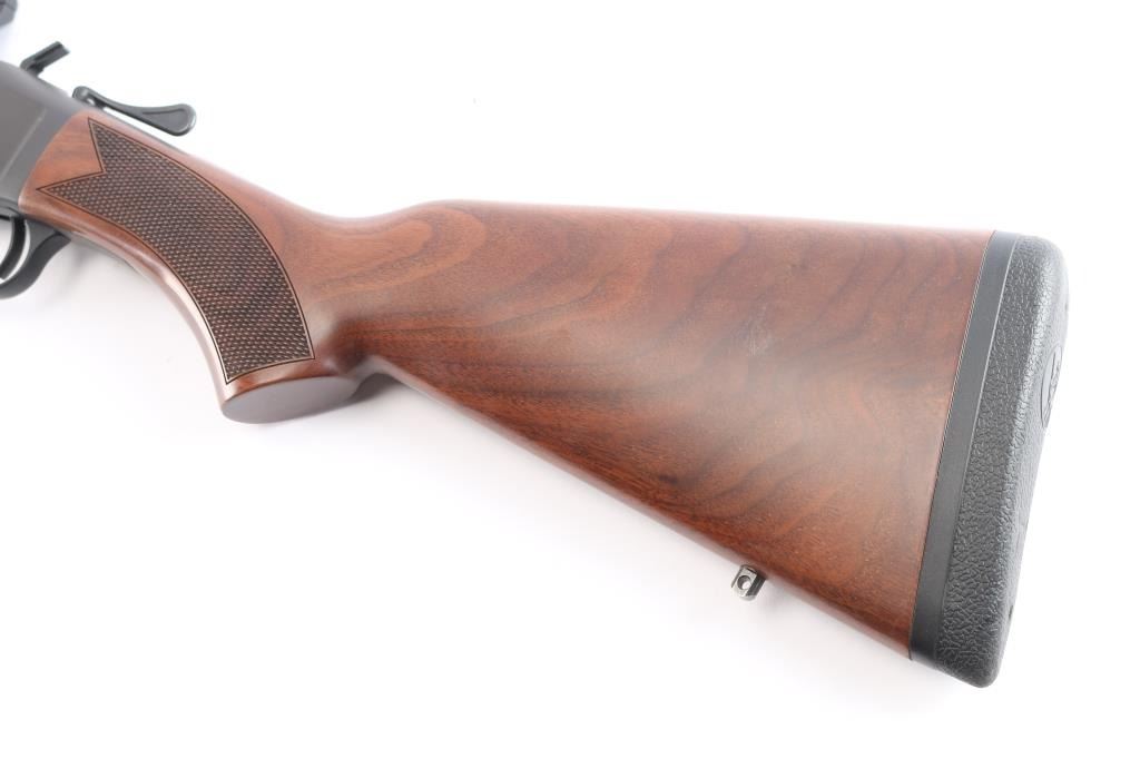 #308ssr01278 American made single-shot break-barrel center fire rifle chambered for .308 Winchester, introduced in 2015 and manufactured in Rice Lake, WI. Rifle features a blued finish, a 22" round barrel with a 1:10 twist rate, raised serrated blade front sight with a brass bead, fully-adjustable folding buckhorn style rear sight, receiver drilled and tapped for optic mounting, utilizes Weaver 82 type scope mounts, smooth curved trigger, serrated external rebounding hammer, extractor, and tang mounted action lever. The American walnut furniture consists of a semi-pistol grip shoulder stock with checkering at the wrist, sling stud in the shoulder stock, checkered forend with a sling stud, and a pebble textured black foam recoil pad with a black spacer. Rifle retains approximately 99% of its blued finish with superficial handling blemishes and scratches. Metal displays no rust, or deformation. The bore is bright with strong rifling. The hardwood furniture is in excellent condition with nothing remarkable. Rifle has a single-piece scope mount with integral one inch rings mounted to the barrel.
