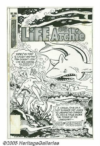 <B>Henry Scarpelli (attributed) - Life With Archie #186 Cover Original Art (Archie, 1977).</B></I> Archie is in a dicey dilemma as the "Doll of Despair" in his hand attracts a toothy shark's ire. This action-packed cover has had the title stats replaced with photocopies. The original stats for the price, and the Comics Code Authority stamp in the upper left corner, as well as a caption box in the lower left corner, have fallen off, and have not been replaced. Some minor glue staining is apparent where these stats were originally located. A great diving theme cover with an image size of 13" x 21", and in Very Good condition.