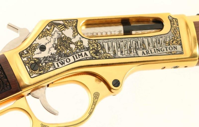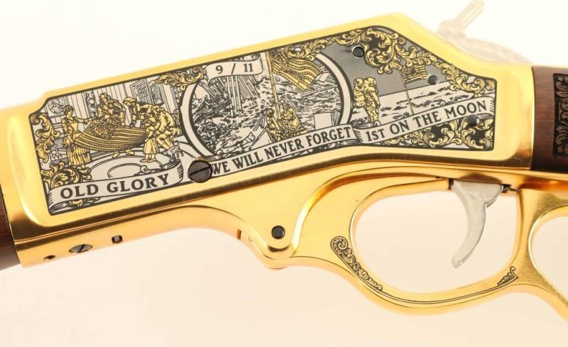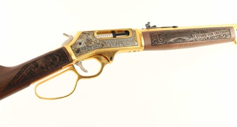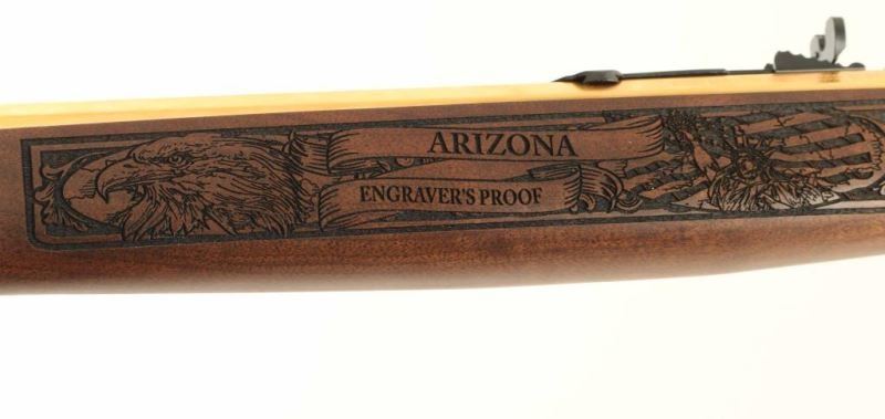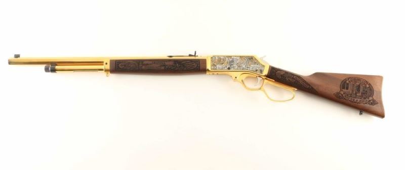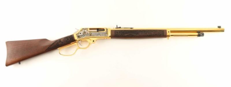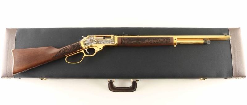 SN: FFSB26416 Model H010B One of a Limited Edition of only 25 rifles for each US state, commissioned by American Legacy Firearms to commemorate the American flag, a symbol that is known around the world. This "Arizona" marked edition lever action rifle in 45-70 caliber features multi layered selective plating in high grade jeweler's nickel and 24K gold, engraved receiver and carved wood depicting scenes related to historical and current events and scenes where the United States flag was flown or played a significant part. Rifle has large loop lever, 22" octagon barrel, 2/3 length magazine tube, buckhorn sights, sling studs and carbine style butt. Original retail price was $2,995 as a special order. Rifle is like new, and comes with luggage style fitted hard case and paperwork. Condition is NRA Excellent - like new *** Modern Firearm ***