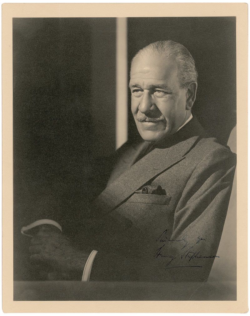 British character actor (1871–1956) who appeared in such films as Oliver Twist, Mutiny on the Bounty, and Captain Blood. Vintage matte-finish 8 x 10 photo of Stephenson sitting behind a desk, signed in fountain pen, “Sincerely yours, Henry Stephenson.” Some light edge creases and ripples, and a bit of light silvering, visible only at an angle, otherwise fine condition.