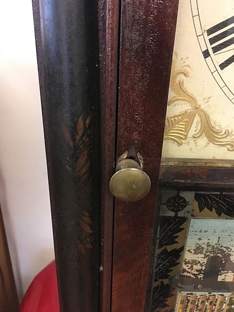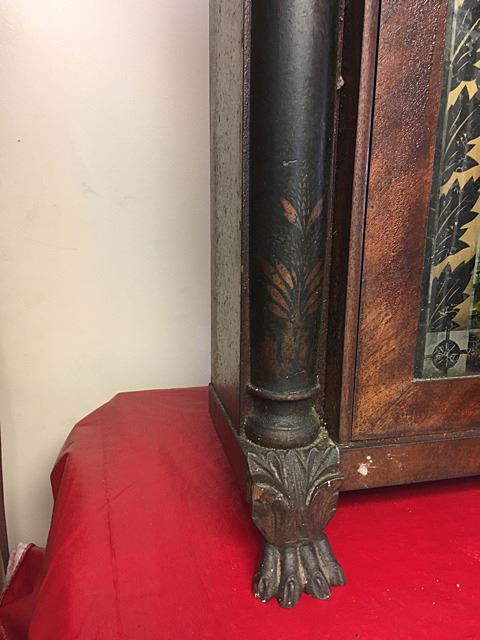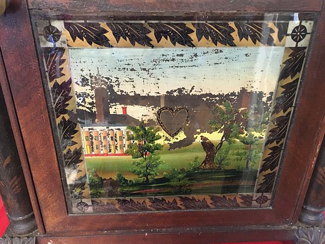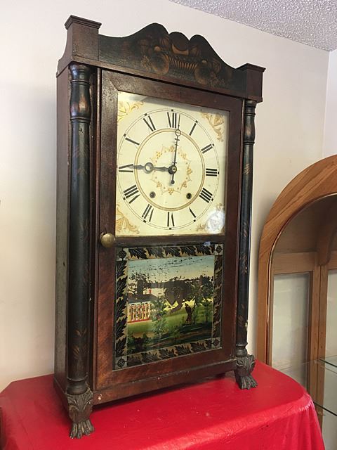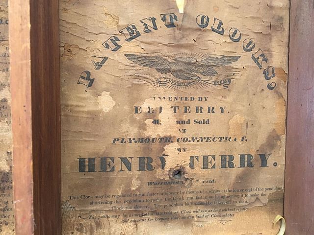 Henry Terry Stenciled column and splat shelf clock, c. 1830. Stenciled half columns and splat with fruit bowl, hand painted dial with raised gilt, reverse painted glass tablet with heart-shaped apeture, claw feet, nice label with American Eagle "Patent Clocks, Invented by Eli Terry, Made and Sold at Plymouth, Connecticut by Henry Terry". 30 hour wooden works weight driven shelf clock. Measures approx. 30" high x 18" wide x 5" deep.