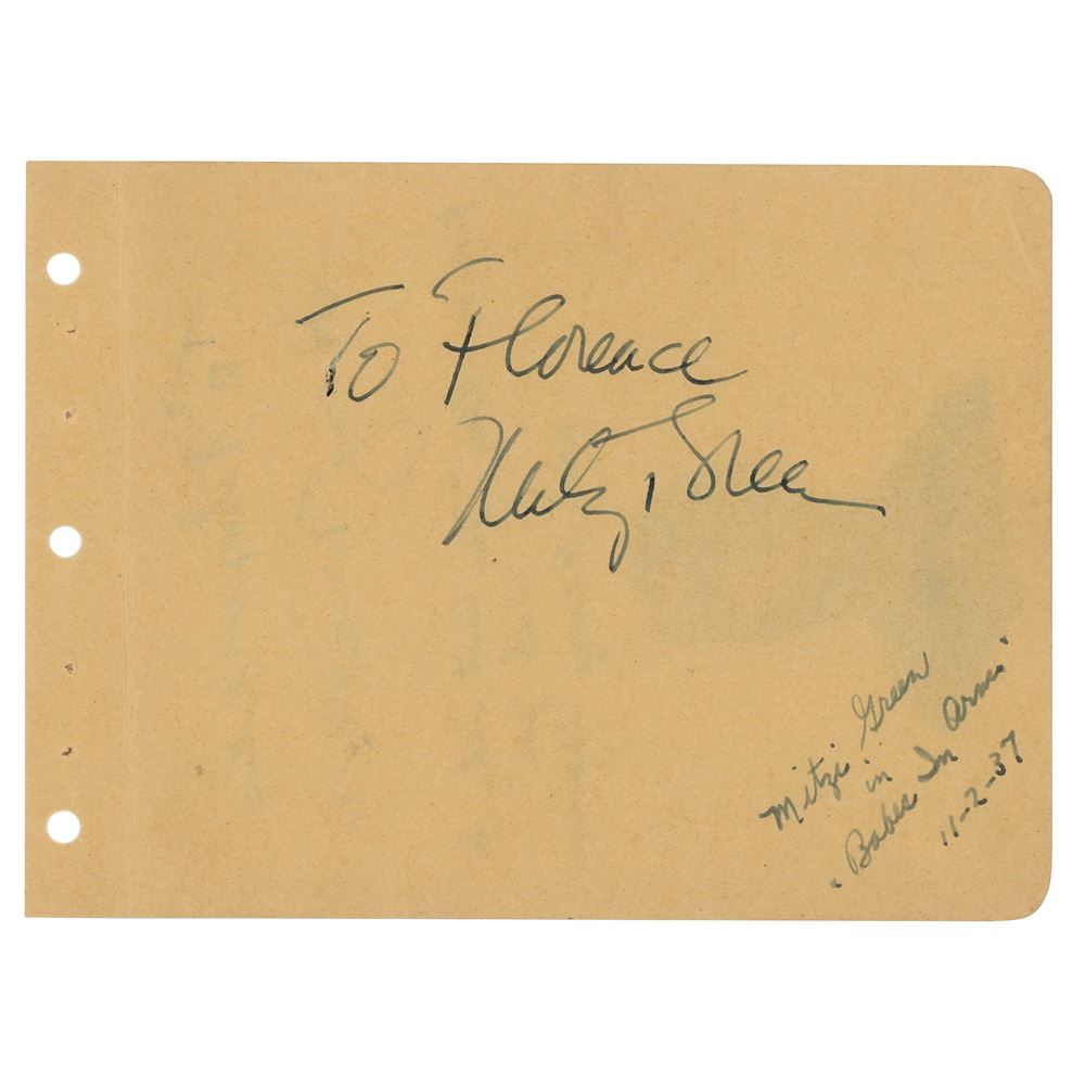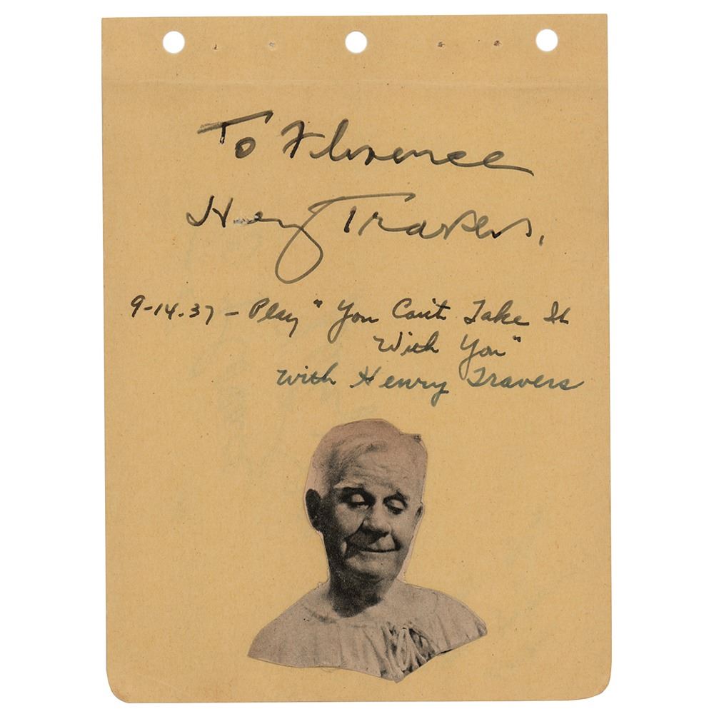 English character actor (1874-1965) who portrayed Clarence the Angel in It's a Wonderful Life. Vintage fountain pen signature and inscription, "To Florence, Henry Travers,” on a beige 4.25 x 6 album page, with a collector's notation below: "9-14-37—Play 'You Can't Take It With You.'" Reverse is signed and inscribed by Mitzi Green. In fine condition.