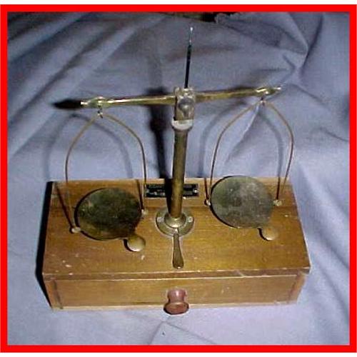 This vintage Henry Troemner balance scale was used in black powder hunting. This wood and brass scale is a No. 9 scale by this Philadelphia scale maker. The scale has a front drawer to hold the extra tools(SEE PHOTO). There are two removable brass trays on each beam end. Good condition with some scuffing on wood surface. I bought this from an estate sale of an avid hunter.