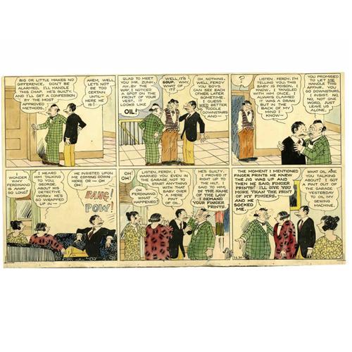 <B>Henry Tuthill - The Bungle Family Partial Sunday Hand-Colored Comic Strip Original Art, dated 7-6-30 (McNaught Syndicate, 1930).</B></I> George Bungle warns his friend, Ferdinand, about their neighbor -- a man who lets his fists do the talking. But Ferdy insists on pursuing a little matter of some missing oil until the bitter end, in these bottom two tiers of a <I>The Bungle Family</B></I> Sunday strip. The art has been hand-painted in watercolor, and has an image area of 21" x 11.5". There is some slight aging apparent overall; otherwise the work is in Very Good condition.