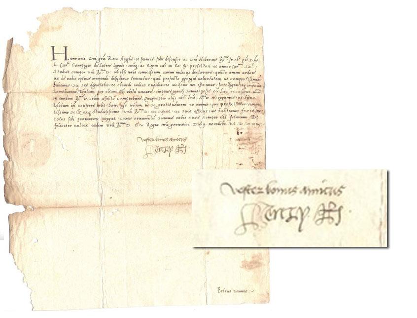 Rare and desirable Henry VIII document signed as King of England and France and as Defender of the Faith. Document appoints Cardinal Lorenzo of Campeggio to the See of Salisbury, which had been promised to him in 1518 and received on 2 December 1524. Shortly thereafter, Campeggio became a key player in Henry VIII's famed divorce from Catharine of Aragon, caught in the unenviable position of having to choose between Holy Roman Emperor Charles V (and Catharine's nephew) or Henry VIII. Upon seeking a divorce from Catharine, Henry VIII sought nullification from the Pope, who dispatched Campeggio to England to settle the matter. Under enormous pressure from both sides, Campeggio denied the divorce, which sparked Henry VIII to strip Campeggio of his title. Campeggio did however, keep his life -- after the decision, the Pope gave Campeggio the castle in Dozza, Italy and Charles took Campeggio's family under his protective wing. Supremely rare 16th century document measures 13'' x 14.75''. In very good condition with folds throughout, small holes at folds and chips along left side. Nice, bold signature by Henry VIII.