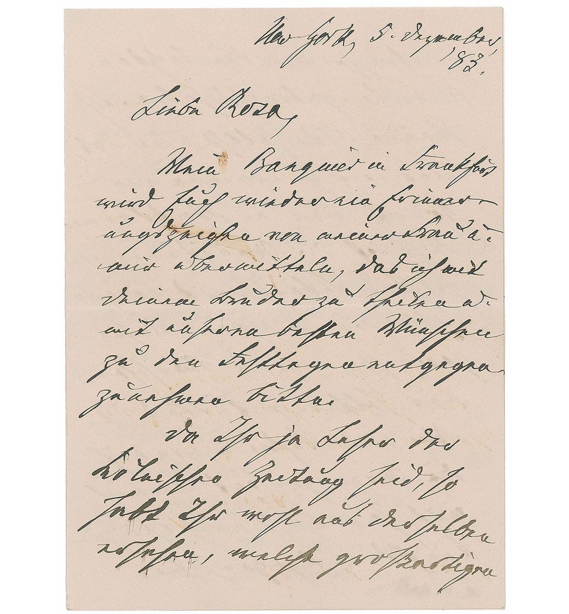 American journalist, publisher, and railway tycoon (1835–1900). ALS in German, signed “Heinrich,” three pages on two adjoining sheets, 4.75 x 6.5, December 5, 1883. Letter to his cousin Rose, in part (translated): “My banker in Frankfurt will again forward you a memento of my wife and me, which I beg you share with your brother, and accept our best wishes for the festive season. There you are readers of the Cologne Gazette, so you have probably seen what great adventures the last few months have brought me. I often marvel even beyond what I have had the privilege [to do], and it seems to me that I enjoy the satisfaction of completing a great life's work to quite a degree, as people rarely do, as with satisfaction of the past, I can say with confidence and look forward to the future.” In fine condition, with brushing and spreading to ink in the signature. This letter was written during a very important period in Villard’s life—he had acquired the New York Evening Post and The Nation, his railroad line to the Pacific Ocean had just opened, and he would soon help his friend Thomas Edison found General Electric.