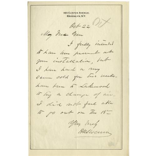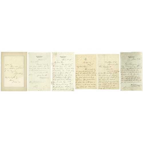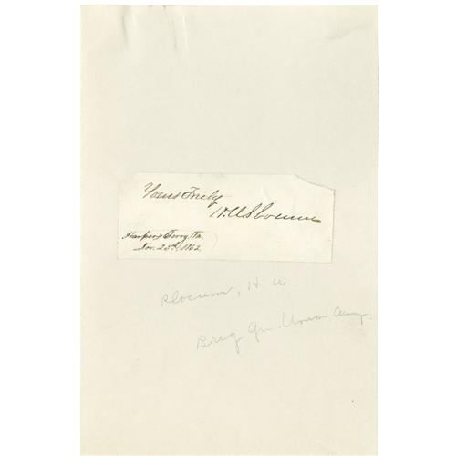 <B> Collection of Henry W. Slocum Letters</B></I> Comprises: (1) Six ALsS: <I>"H W Slocum:,</B></I> three 1p, two 2p, one 3p, 5" x 8" to 5" x 8.75", 1875-1891, three undated. Concerning delivering a speech at Gettysburg, writing a book, Col. R.M. McDowell, meeting Civil war veterans, obtaining copies of the Hancock Memorial, and his inability to be present at an installation. One letter is tipped to another sheet, one has mounting remnants, and one is wrinkled. (2) Autograph Statement Signed: <I>"H.W. Slocum",</B></I> 1p, 5" x 8.75". Brooklyn, N.Y., June 8, 1891. In full: <I>"Gen Sherman was my commanding officer and my personal friend. His greatness as a soldier is acknowledged throughout the world - The last years of his life - spent in New York - endeard him to thousands for his social qualities."</B></I> General William Tecumseh Sherman had died in New York City on february 14, 1891. Glue stains and mounting remnants on verso resulting in show-through and some wrinkling on front. (3) Signature: <I>"Yours Truly/H. W. Slocum"</B></I> on irregularly cut 4.5" x 1.75" slip of paper affixed to a 6.25" x 9.5" sheet. "Harper's Ferry, Va./Nov. 25th 1862" has been penned in an unidentified hand at lower left of signature sheet. (4) Two different engraved bust portraits of Slocum. (5) <B>Daniel E. Sickles</B></I> ALS: <I>"D. E. Sickles",</B></I> 1p, 4.5" x 7", on his embossed monogrammed stationery. To Douglas Tyler. No place, September 13, 1853. In full: <I>"Please hand to bearer whatever you have for me."</B></I> Tipped to 6" x 9" page. 11 items. From the Henry E. Luhrs Collection. Accompanied by LOA from PSA/DNA.