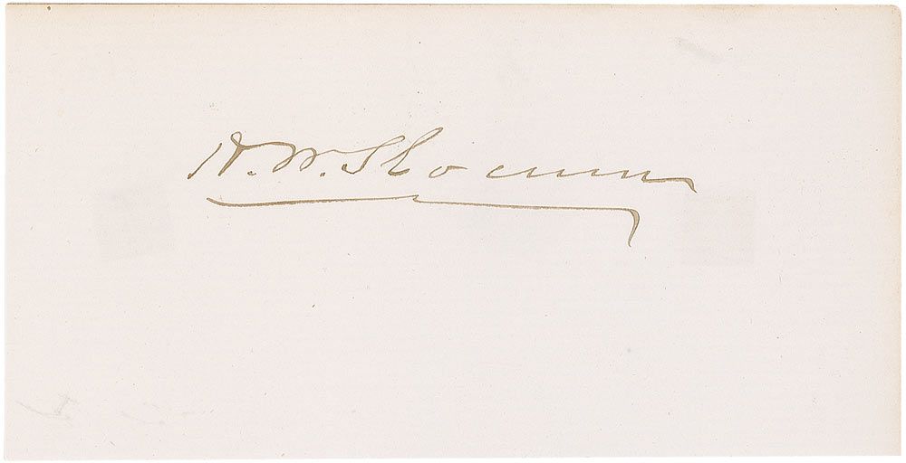 Union general who fought at Gettysburg and accompanied Sherman on his March to the Sea. Ink signature, “H. W. Slocum,” on an off-white 5 x 2.5 clipped slip. In fine condition, with some trivial toning and light adhesive remnants on the reverse.