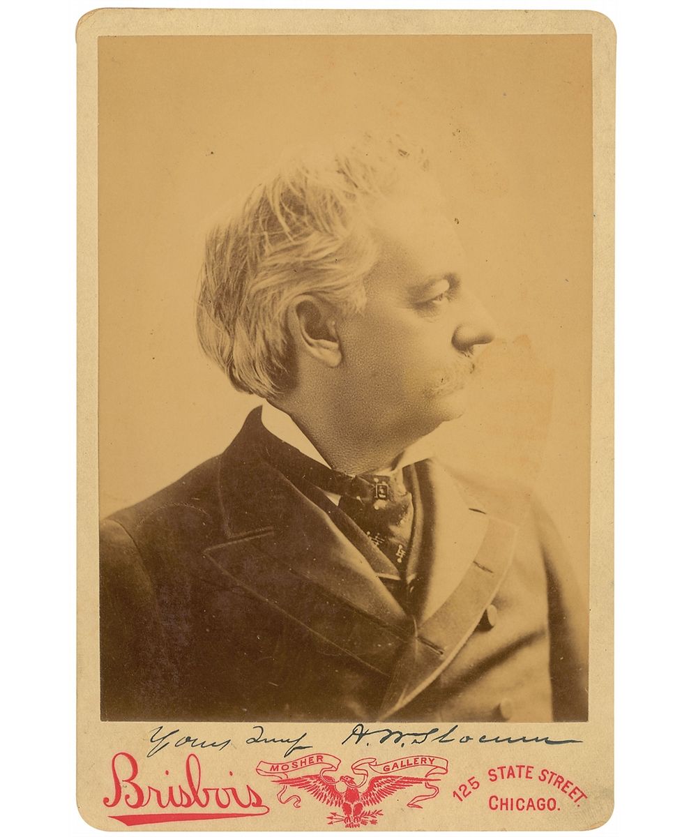 Union general (1827–1894) who fought at Gettysburg and accompanied Sherman on his March to the Sea. Original 4.25 x 6.5 cabinet profile photo by Brisbois of Chicago, signed in the lower border in black ink, “Yours truly, H. W. Slocum,” and signed again on the reverse, “H. W. Slocum, late Maj Gen US Vols.” In very good condition, with light surface marks, mild rubbing and light staining to lower portion of image, a few edge dings, and light soiling and pencil notations to reverse.